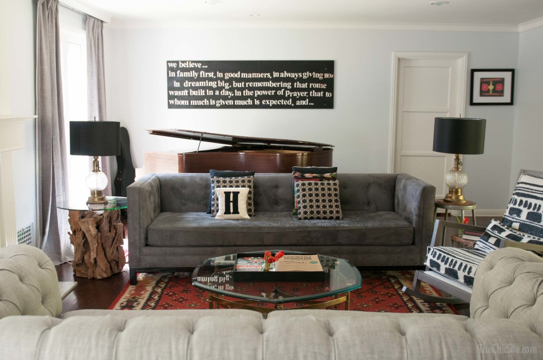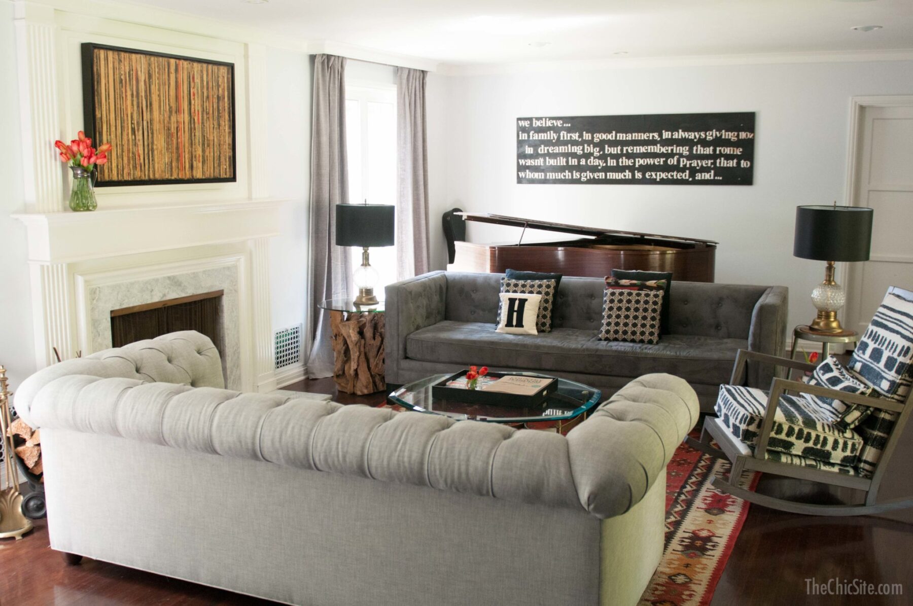 The two biggest changes in the living room makeover are the paint and the layout. By using this light blue-ish grey color on the walls I was able to have a lot of fun with the colors of my rug, my throw pillows and the paintings on the walls. Originally we used to have one sofa facing the fireplace and some chairs surrounding it. By adding and extra sofa we expanded the seating in the room. This is so great since we tend to have company over often. The wall art above the piano is something I made a long time ago, and you can see how I did it here if you’re curious.