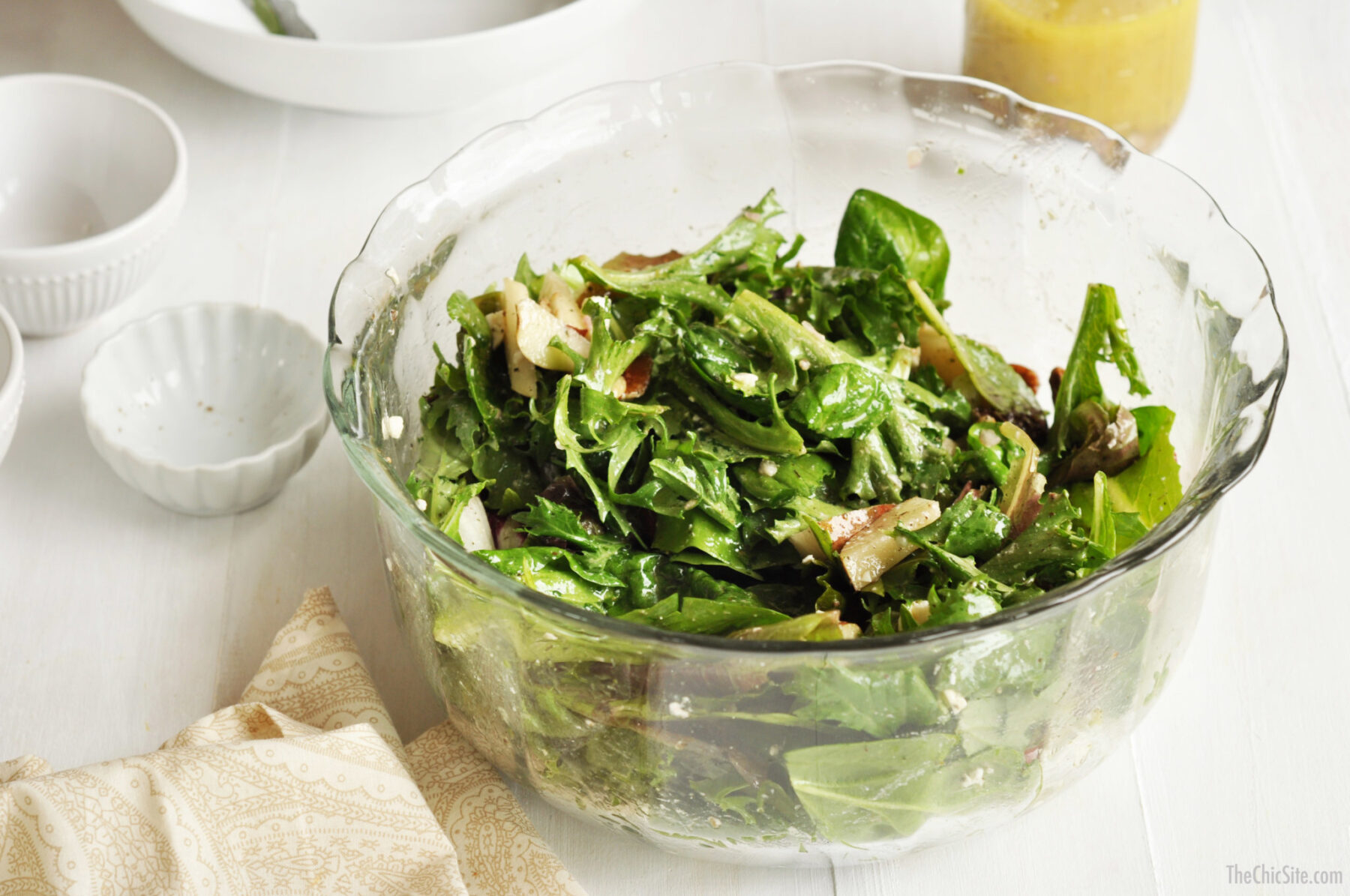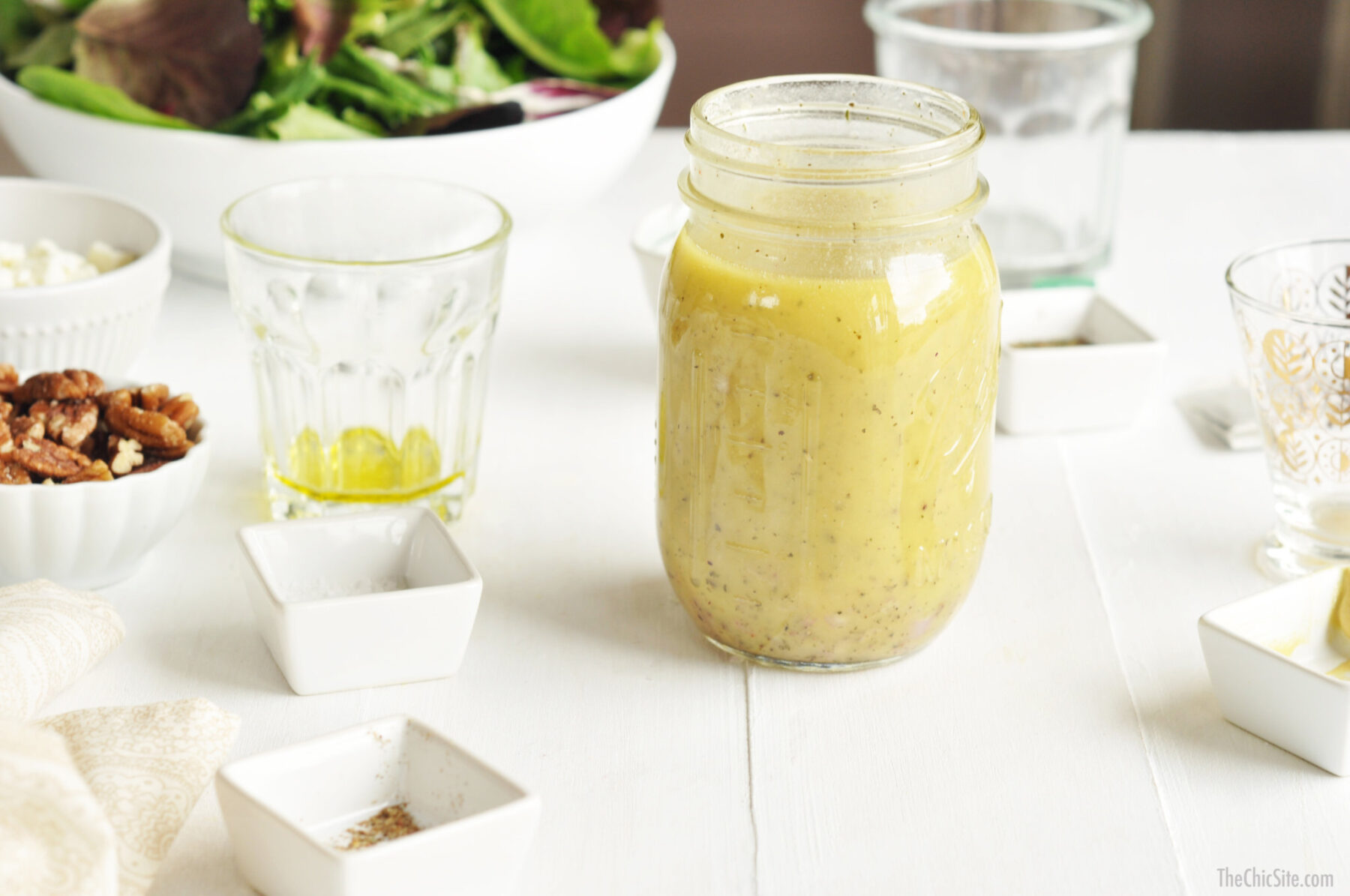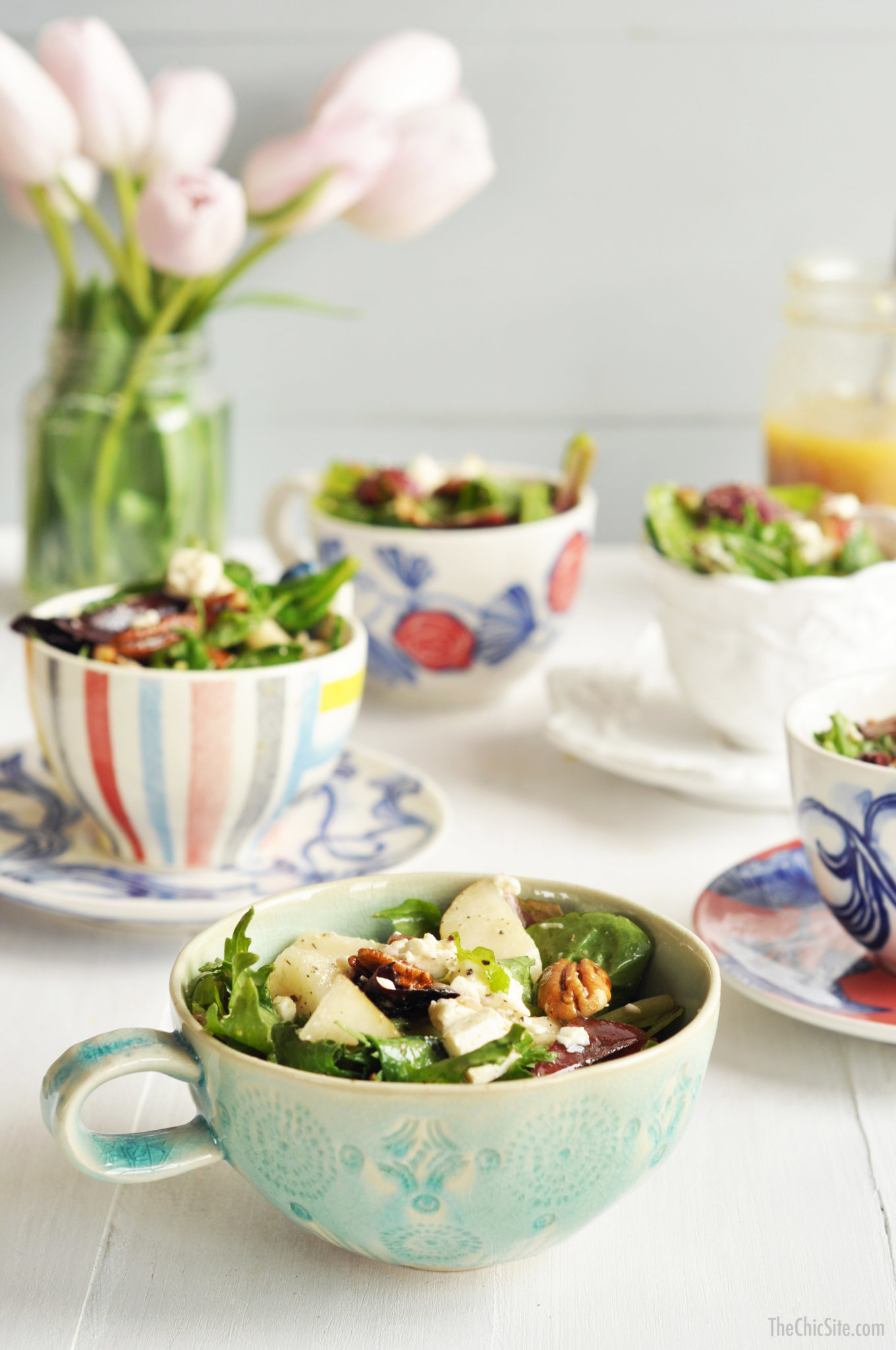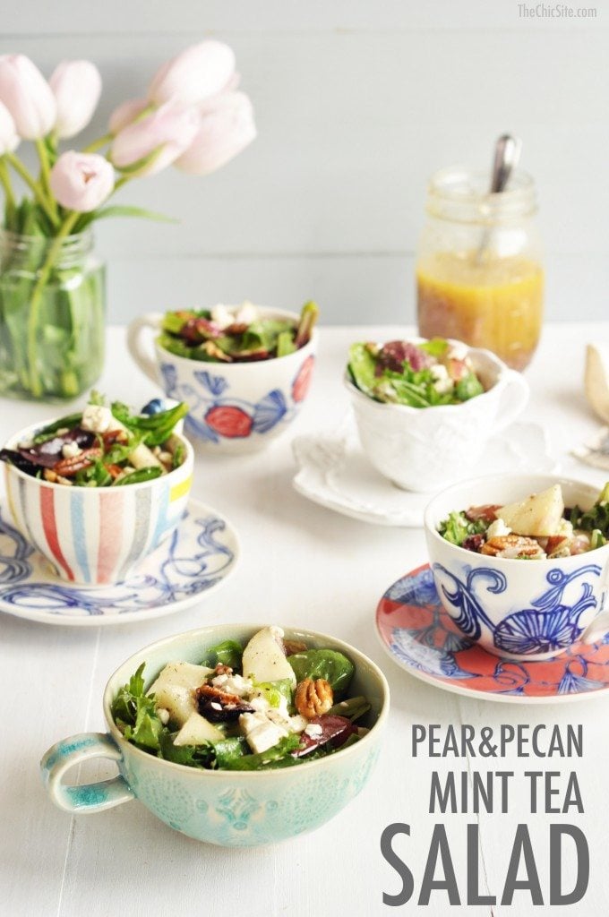 With Mother’s Day around the corner we thought it would be a great idea to post a light and healthy brunch recipe. We also thought that it should be as cute as it is easy to make. Take those tea cups and saucers you have laying around (it doesn’t matter if they don’t match) and use them to serve the salad at your next brunch. This one here is easy to make. We took spring greens mix and tossed them with pecans, pear chunks, and feta cheese. And because they’re in tea cups, we made a delicious salad dressing that’s infused with mint tea!