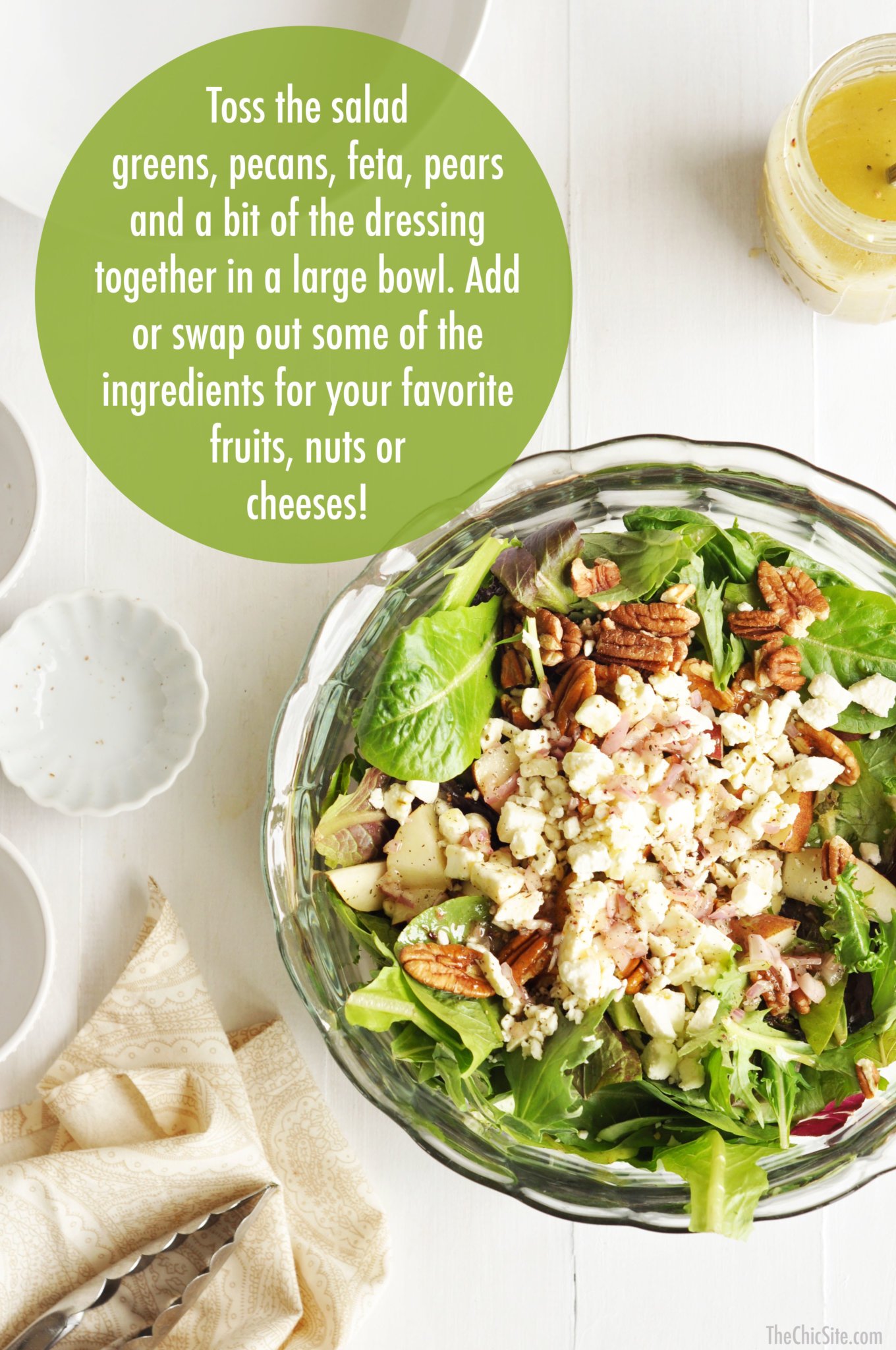 - To make the salad, combine the lettuce, pecans, pear, and feta cheese with a bit of the salad dressing in a large bowl. Toss to fully coat. Serve immediately.
