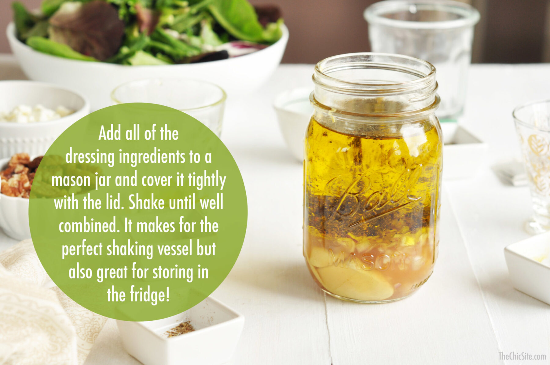 Combine some of your favorite salad ingredients in a large bowl and toss together with some of your homemade dressing!