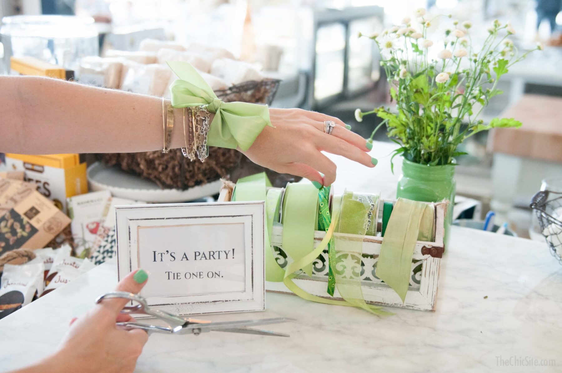 I really wanted to add some fun element of the party that was green. My instagram this month is themed to the color green and I couldn’t resist tying it in with the party. Since the character in the book always wears a bracelet, my mind went in that direction. Unfotunately, I thought this two days beforehand which wasn’t enough time for us to get everyone jewelry. Instead, we made a little ribbon station. Each guest was asked to tie on a green ribbon, and even though everyone at Chic teased me about the idea, I thought it turned out so cute! No matter what kind of party you’re throwing, I think it’s fun to have something for guests to do when they arrive. Sign a guest book, take a picture or even tie a green bow on the wrist… starting with an activity (and a drink!) gets everyone in the spirit.