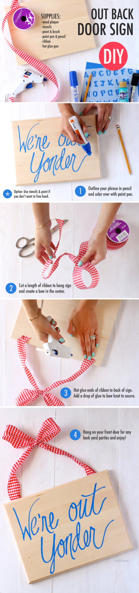 When you come over to our house for a barbecue — or really any time you come over during the summer months — by the time you arrive, we’re likely already going to be out back. Years ago I decided we needed a way to let people know to just come around and through the gate rather than ring the bell for an empty house. For the longest time I would just put a sticky note out front and then I decided I could make something cuter and created at Front Door Sign. This craft is incredibly easy to make and for those of you who spend so much time outside like we do, it’s an easy way to tell your guests where to go when they arrive.