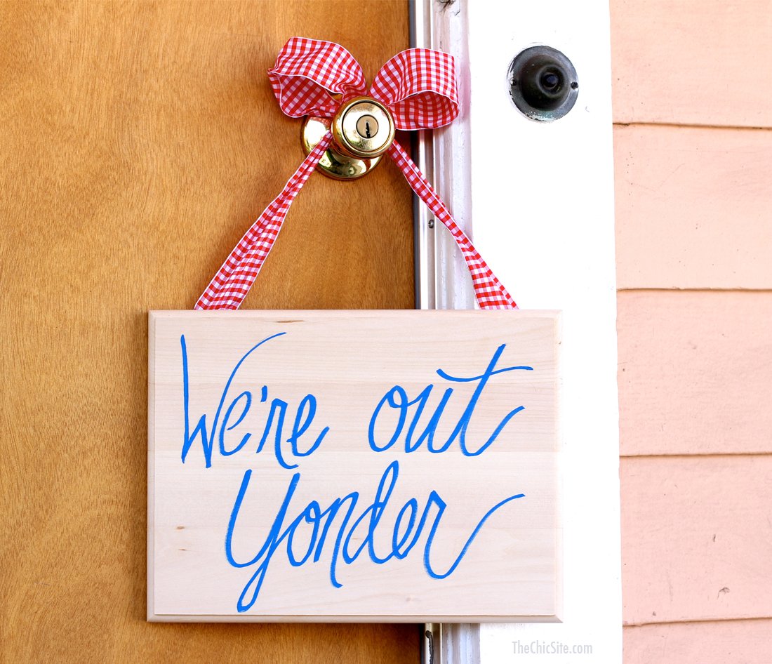 A couple of important tips. Go to a craft store and get really lightweight wood otherwise your front door sign is eventually going to come unglued from your ribbon. Also, feel free to use stencils if you don’t want to hand write your sign. Use whatever line makes sense to you “come through the side gate” or “the door is open, come on in” etc.