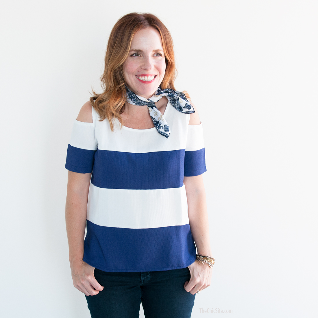 This is such an easy weekend look. In fact, whenever my hair is acting crazy I don’t throw on a hat, I throw on a scarf. Tie it around your head like Rosie the Riveter or wrap it around your forehead like the Karate Kid. I always just start with a simple bun and then see which style is most flattering. Either way, adding the scarf distracts from whatever is going on with my hair at that moment.