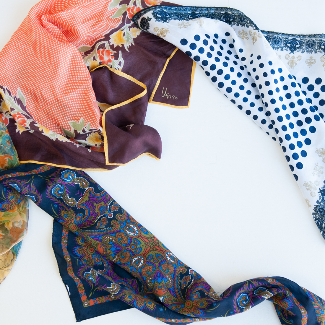 I’ve collected and loved vintage scarf style for as long as I can remember. When I first moved to LA and only shopped at second hand stores, vintage scarves were an easy way to add color to my wardrobe without spending much money. They are usually only a buck or so and you can use them so many ways! If some of you have one or two of these square vintage scarves in your closet here’s a cool way to incorporate them into your current look!