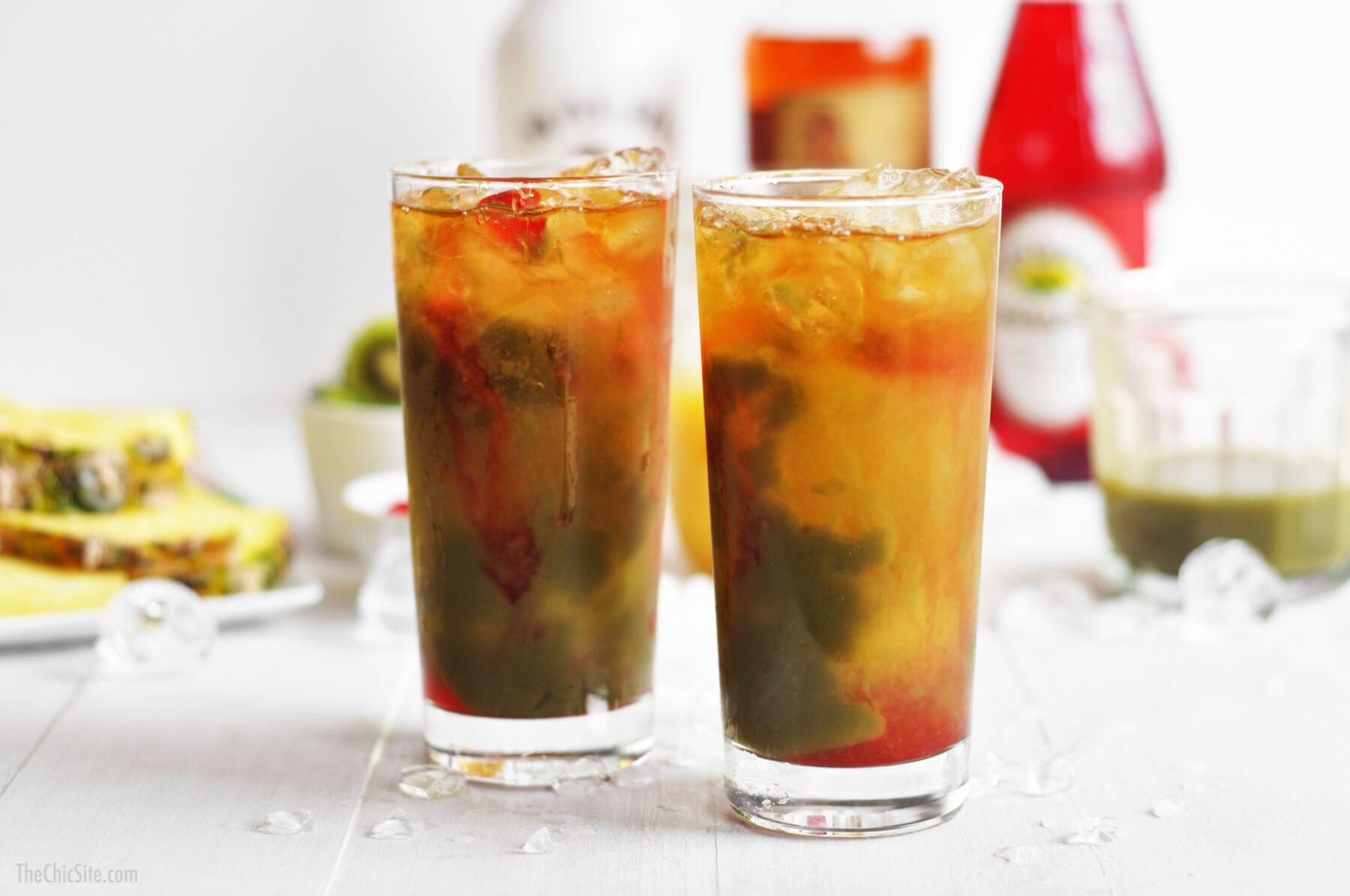 - Fill a tall cocktail glass with ice. Pour each of the ingredients in layers, starting with the pineapple juice and kiwi juice. Then the light rum, dark rum and grenadine. Garnish with pineapple slices, kiwi slices and cherries. Enjoy!