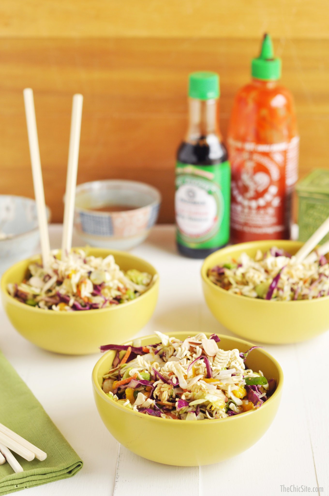 I just used a store bought Asian-style vinaigrette to toss everything together in. Take some help from the grocery store to make this salad in no time at all!