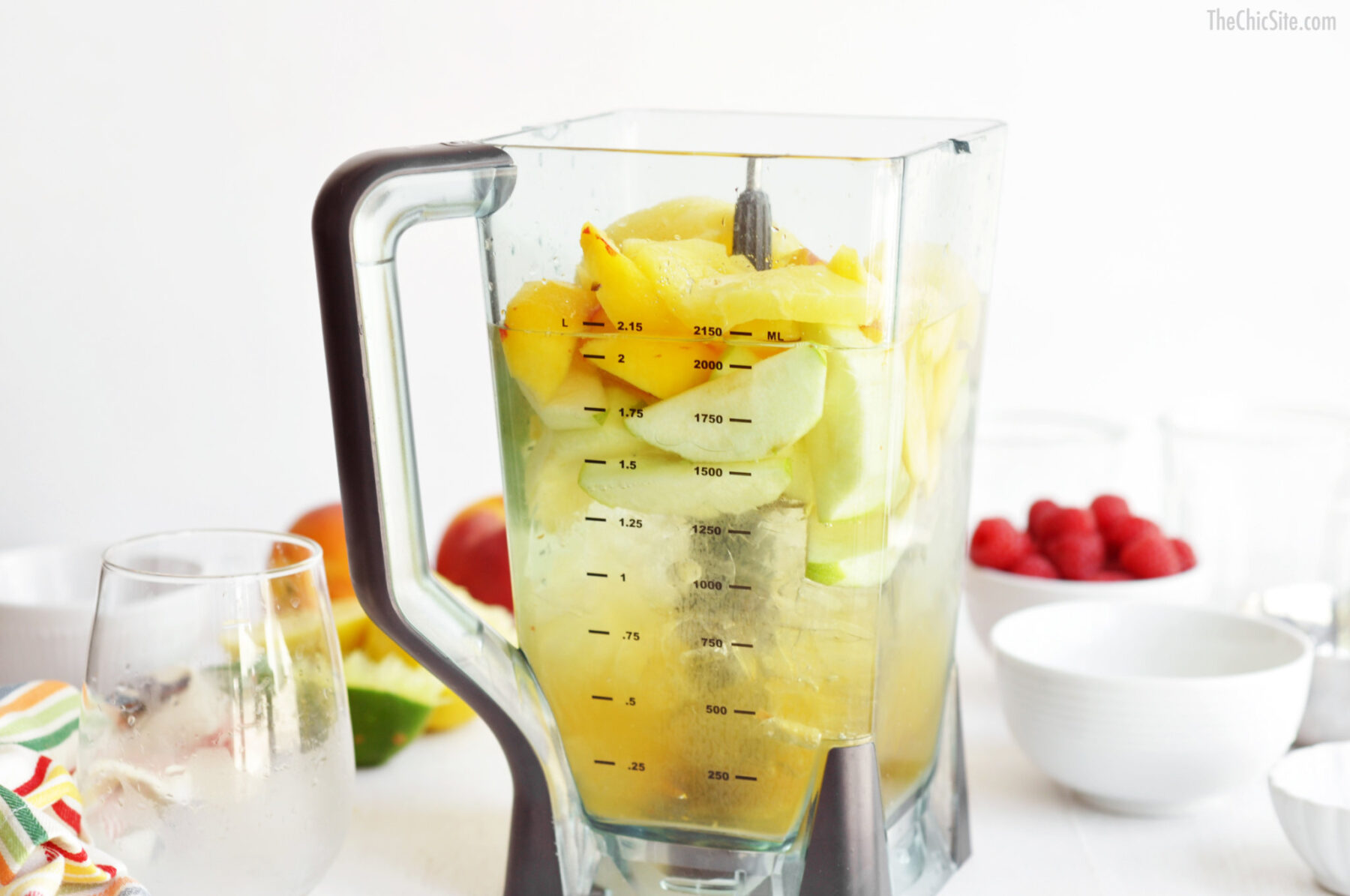 Then throw in the fruit. You can switch it up and add whatever fruit you like in your sangria. I’m using fresh peaches, green apples, and pineapple. Depending on how ripe your fruit is, add a bit (or more) sugar to the blender.