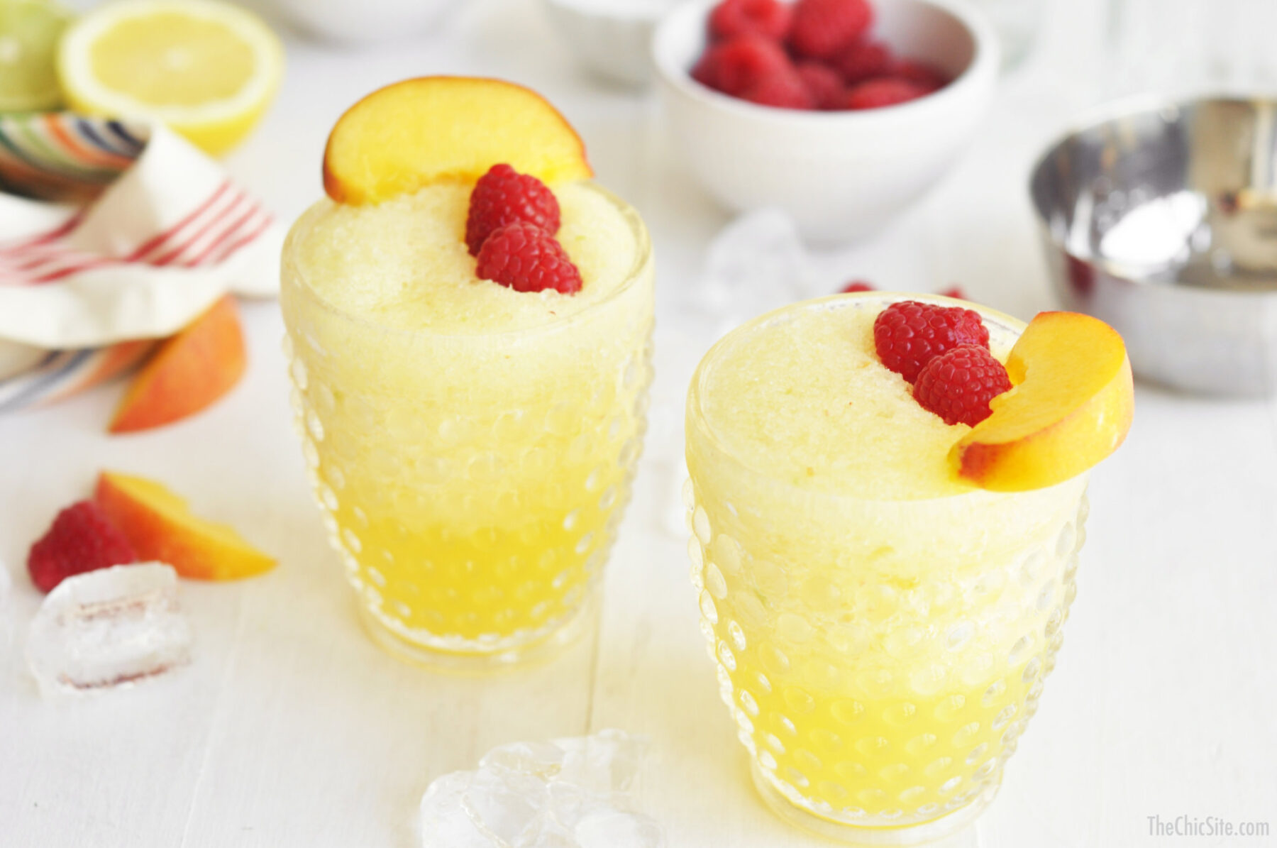 - Pour into glasses and garnish with fresh raspberries and a fresh peach slice. Serve immediately!