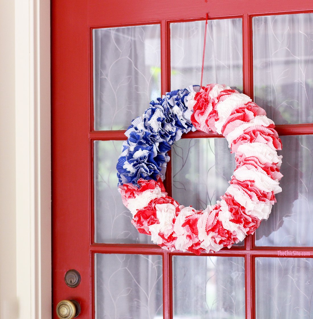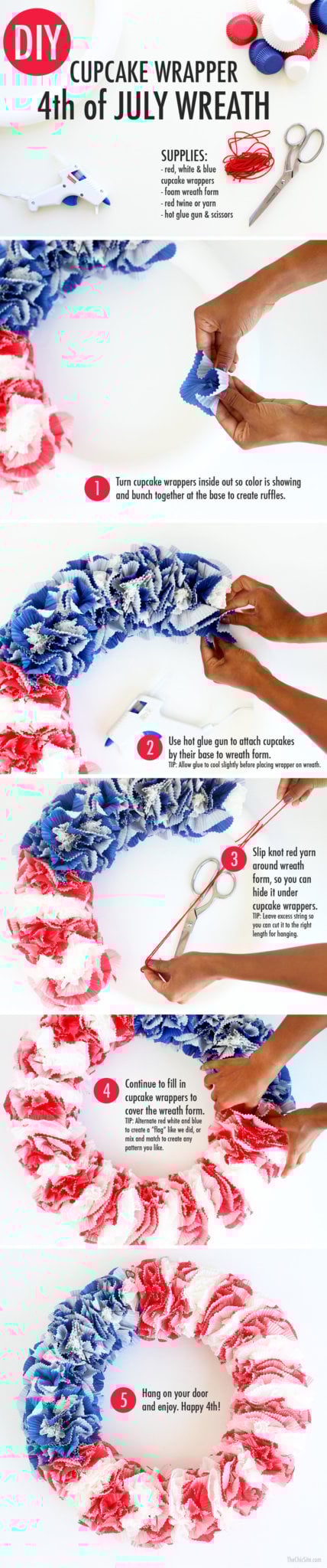 Admittedly, adding the cupcake wrappers for your red, white and blue wreath is a little time consuming… but it isn’t difficult. Plus you only need a handful of ingredients and if you’re like me you already have wrappers leftover from your Banana Split Cupcakes or your Cupcake Wrapper Garland. Have your kids prep the wrappers and you can handle the glue gun… it’s a patriotic craft for the whole family!
