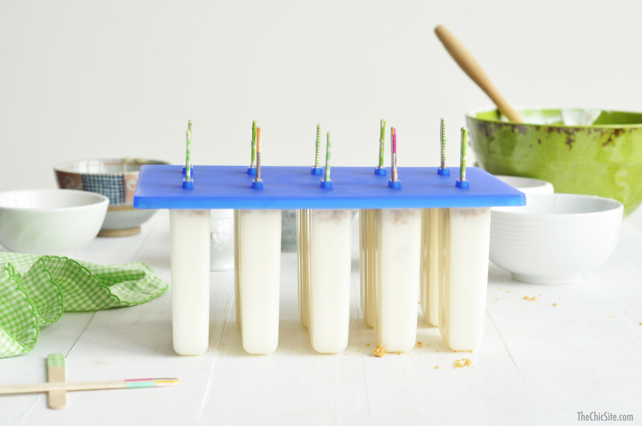 - Fill a popsicle mold about 3/4 of the way up with the cheesecake filling. Top with the graham cracker mixture, patting down to create a tight even layer. Place the lid on top of the mold and stick a popsicle stick into each popsicle.
