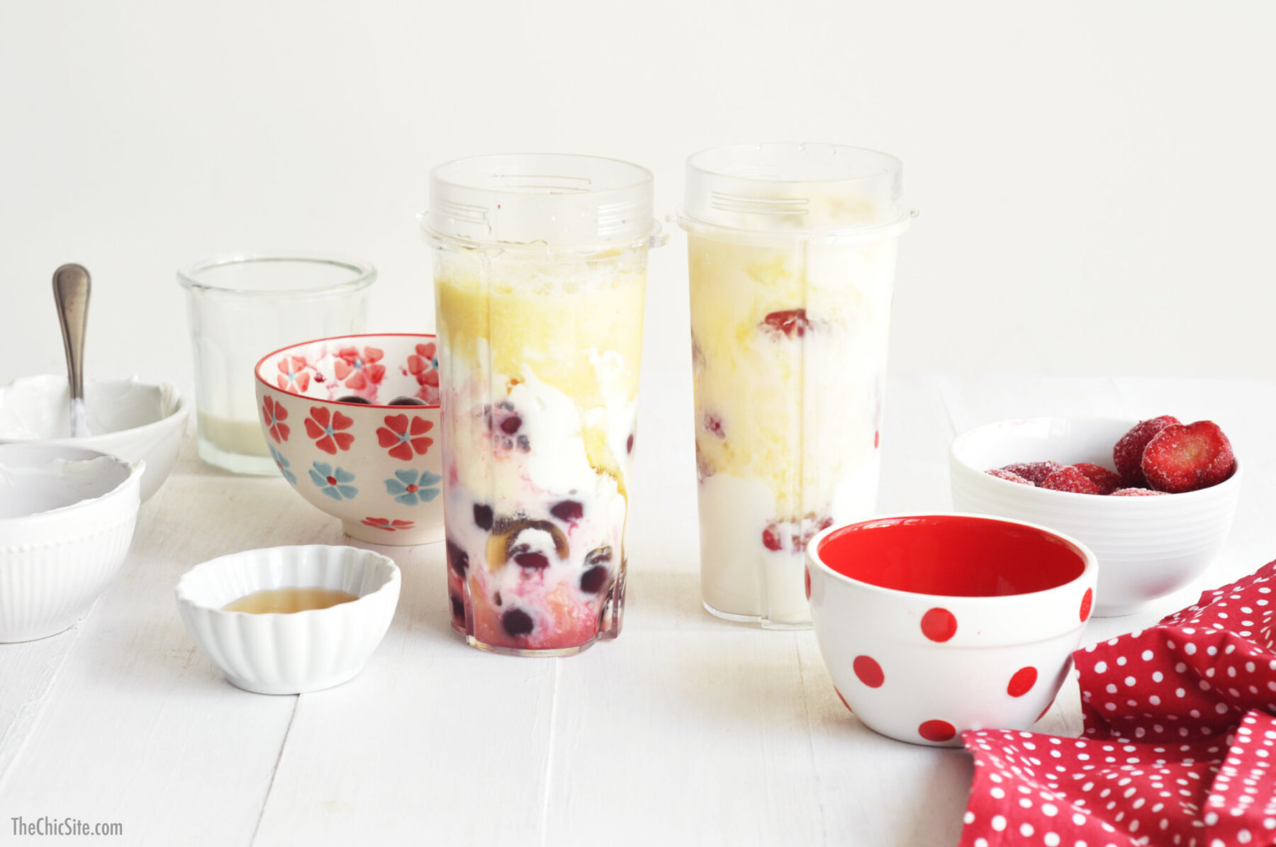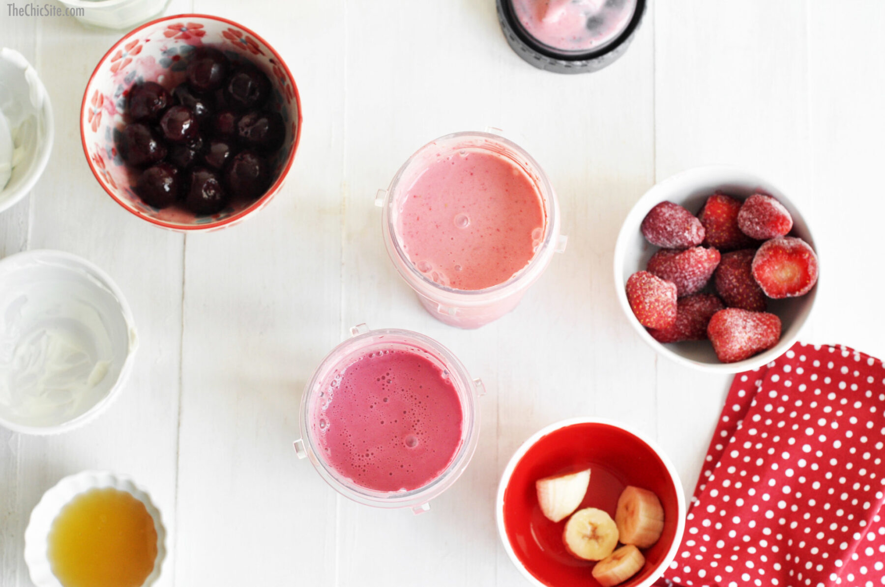 Fill them both up with milk, honey, Greek and yogurt. Then if you want to create different flavors, add frozen cherries to one blender and frozen strawberries and banana slices to the other. You can use whatever fruit your like, but it’s best with frozen fruit, since it acts like ice in the recipe.