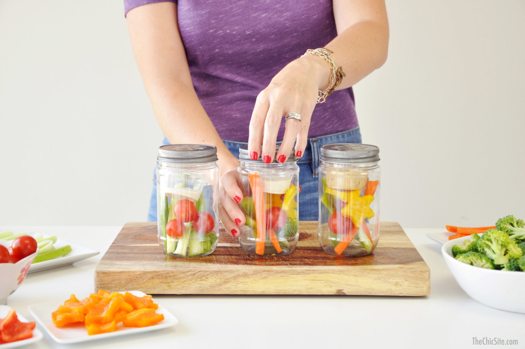 I used these plastic mason jars because A: even my minions can’t break plastic and B: they have holes in the top which allows the veggies to breath.