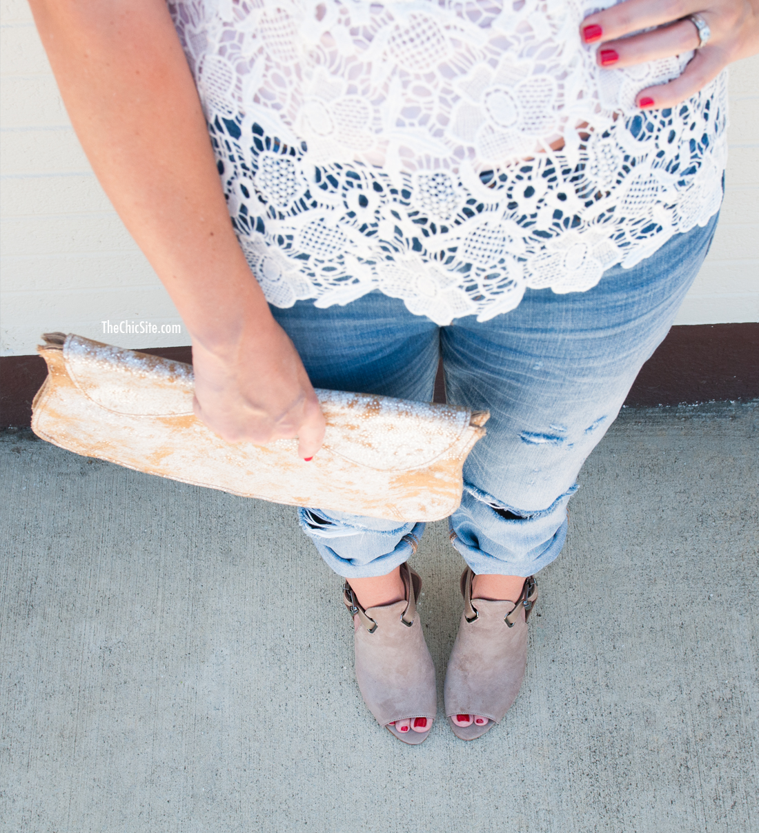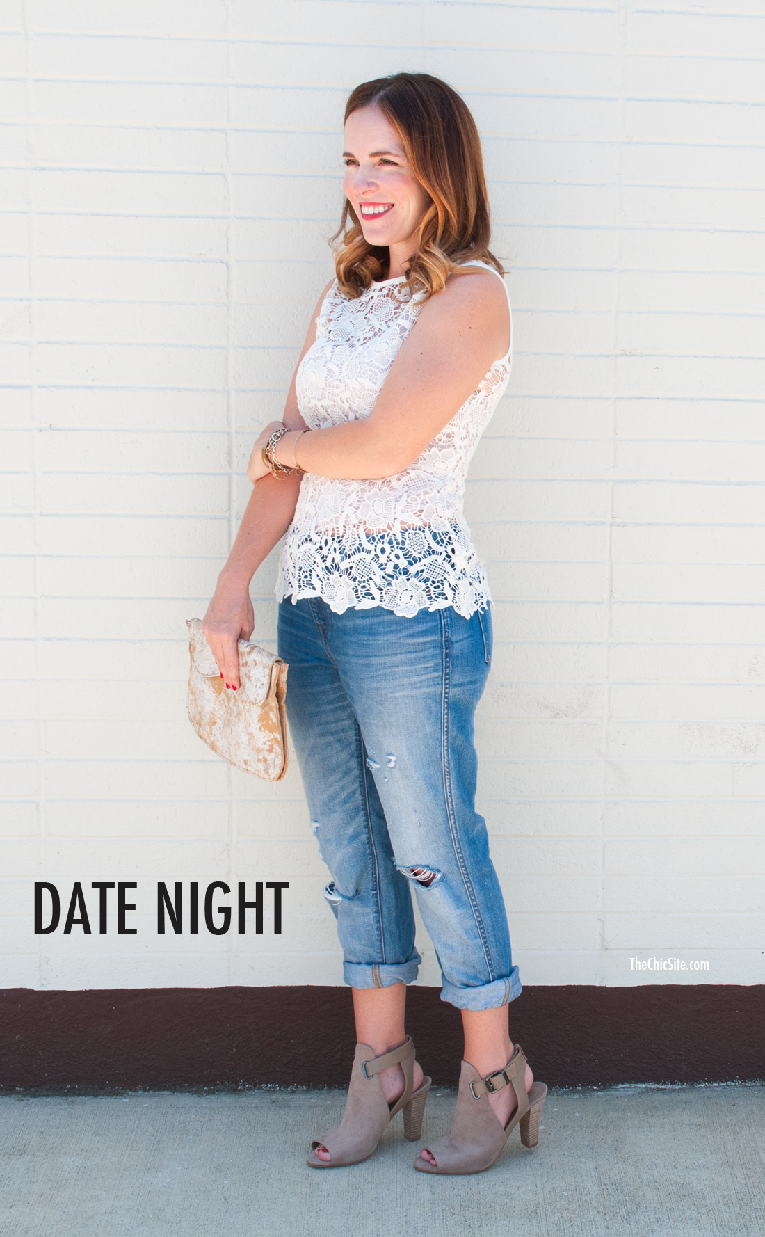 For date night I love the idea of boyfriend jeans, which can look sloppy but instead look adorable when paired with the right heel. In this case the nude pumps elongate the leg and look great with a cream colored lacy top.