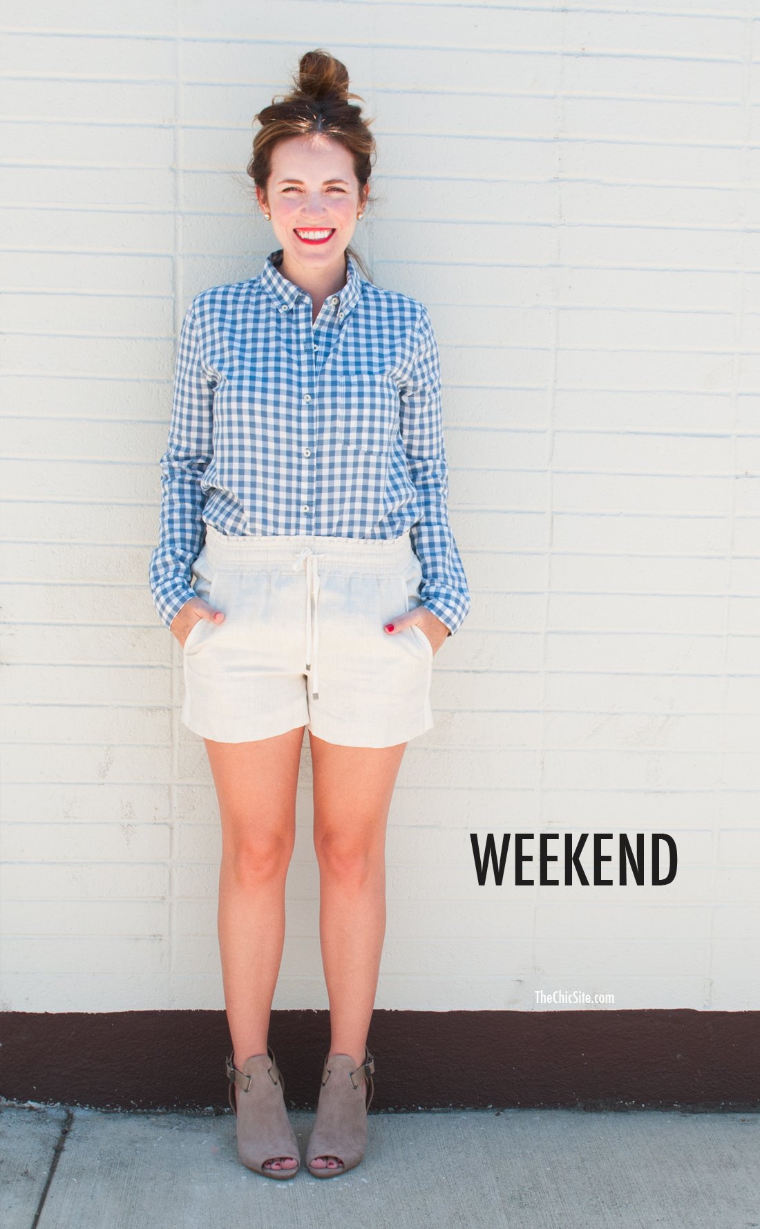 For the weekend I paired my favorite summer shoes with a gingham button down and some linen shorts. Great stud earrings and a top knot is a must!