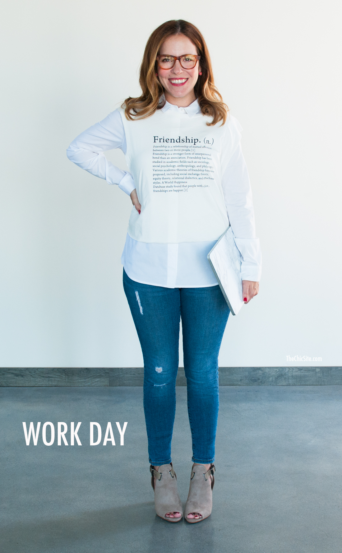Jeans with a button down shirt is basically my uniform at Chic HQ. In this instance I topped my button down with a fun crop top… which I love, but which I cannot pull off in it’s original midriff baring form. #QVCStyle