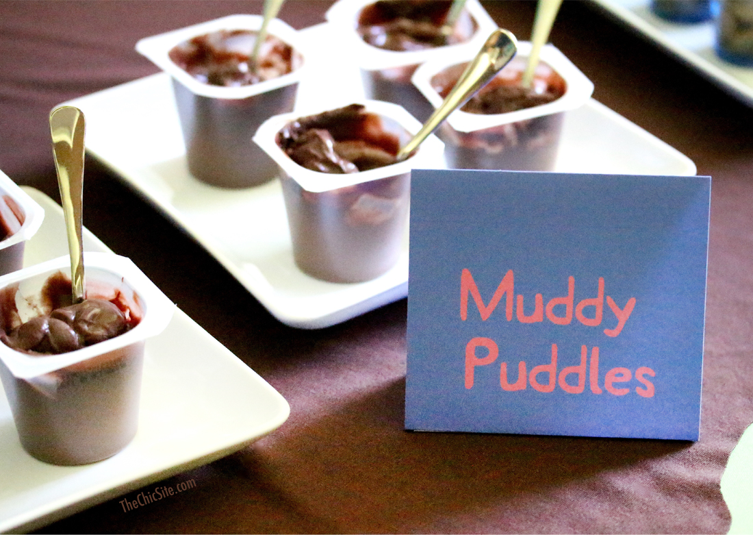 I also served miniature muddy puddles (pudding cups) and Goldie crackers (goldfish crackers in a blue cup) to continue the theme.