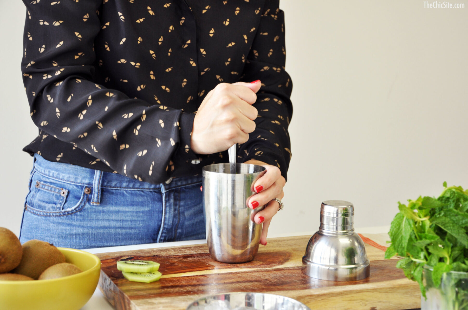 Start by peeling and slicing a few fresh kiwi. Throw the slices into a cocktail shaker along with the cucumber slices.
