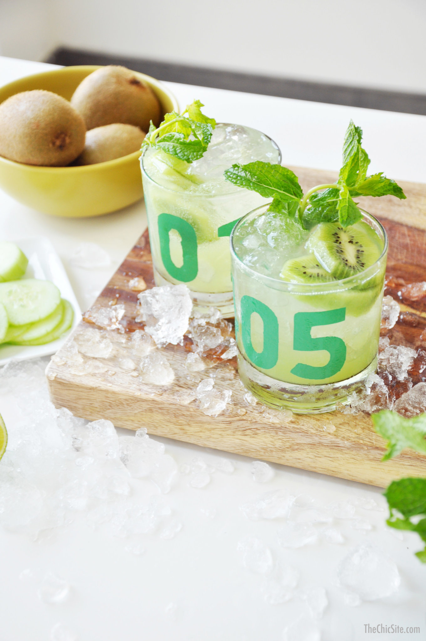 - Throw in the kiwi and cucumber slices into a cocktail shaker along with the mint. Muddle with a spoon until completely broken down. Add the rum and fill with ice. Cover and shake vigorously for few seconds until chilled. Strain into two glasses (filled with ice) and top each with club soda. Garnish with mint, kiwi slice and lime slice.