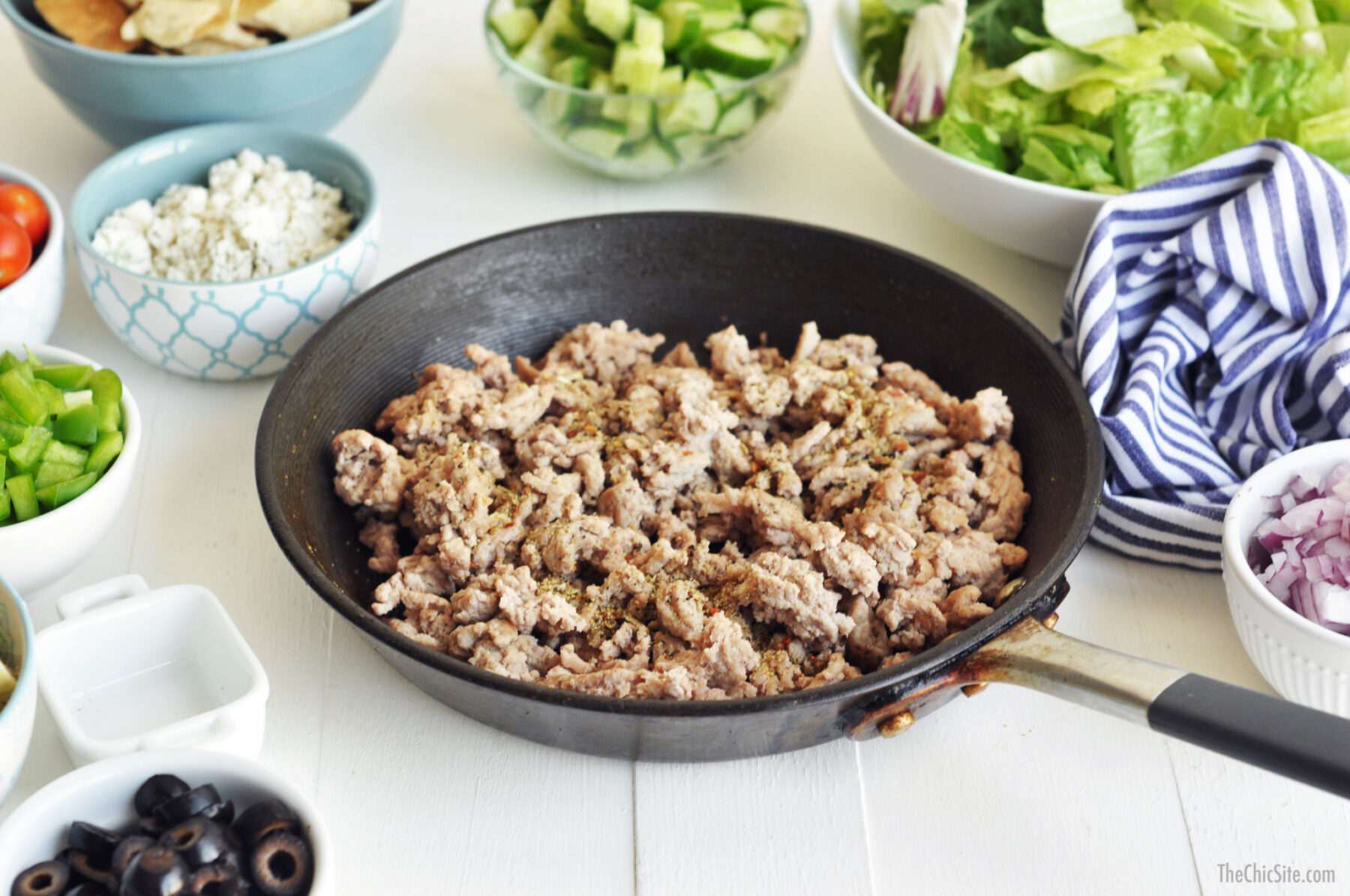- Heat a large skillet over medium high heat, with the olive oil. Add the ground turkey and break down with a wooden spoon. Cook until browned and crispy, about 10 minutes. Add the seasoning blend and cook for another minute or two. Remove from heat and allow to cool down.