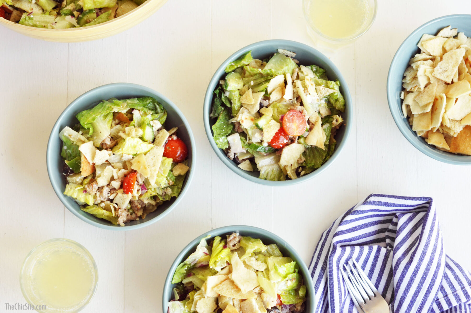 Right before serving add the crushed pita chips and stir to combine. You don’t want to add them too early or else they’ll get soggy.