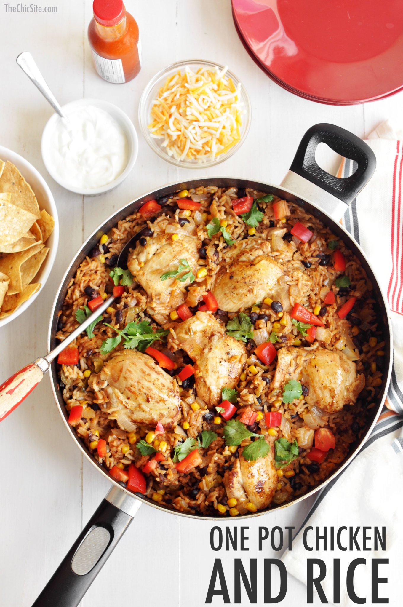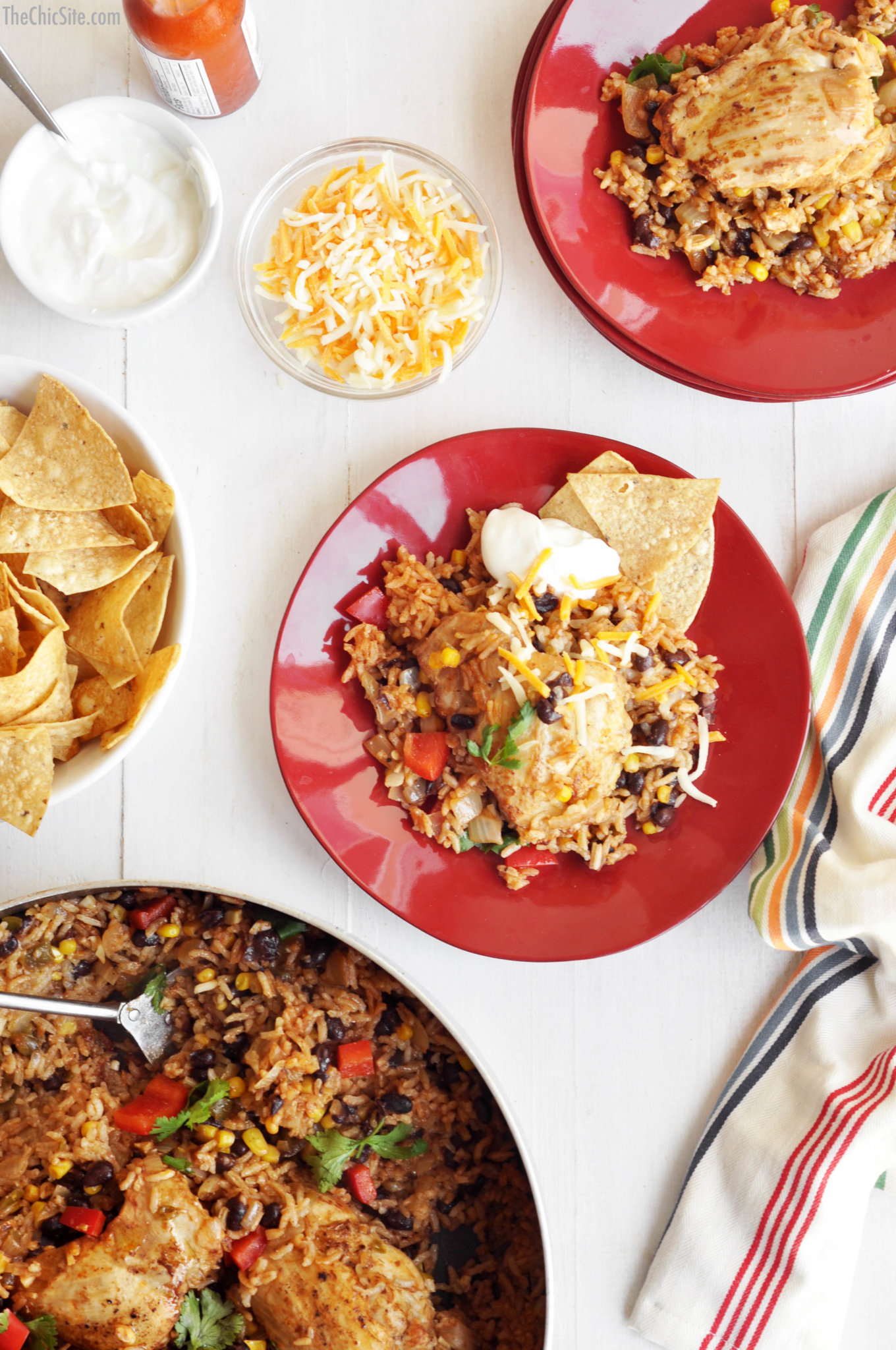 Fluff up the chicken and Mexican rice with a fork, right before serving. If you make this in a big ole pot, you can just bring it to the table and serve it right from the pan.