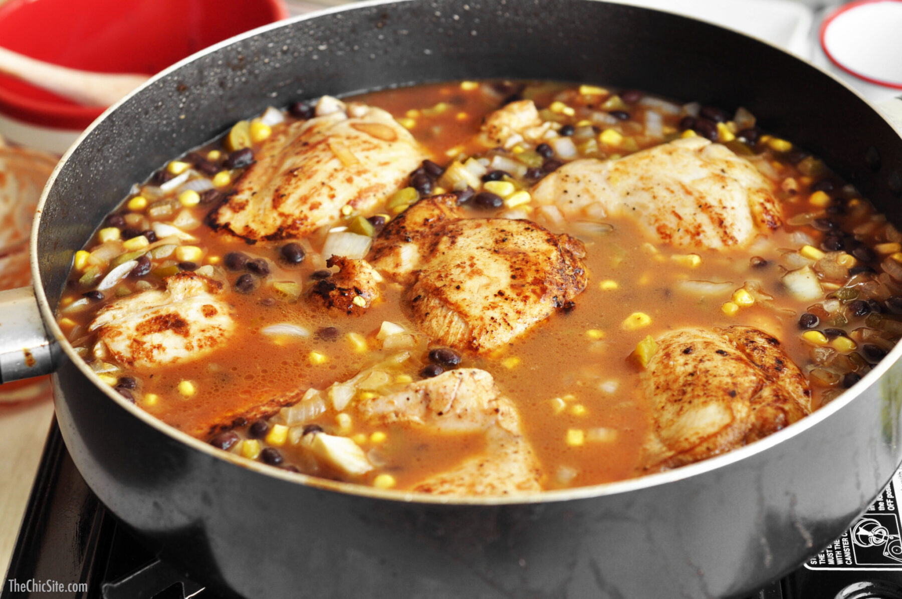 - Set a large skillet over medium-high with the olive oil. Sear the chicken on both sides until browned. You’re not cooking it all the way. Just getting the brown color and flavor. Transfer to a plate and set aside. In the same skillet, add the onions, garlic, rice, corn, black beans and green chilies. Sauté for about 8 minutes. Stir in the broth and tomato sauce and return the chicken, tucking it into the rice and veggies. Cover, lower the heat to low and cook until absorbed and the rice is tender and fluffy.
