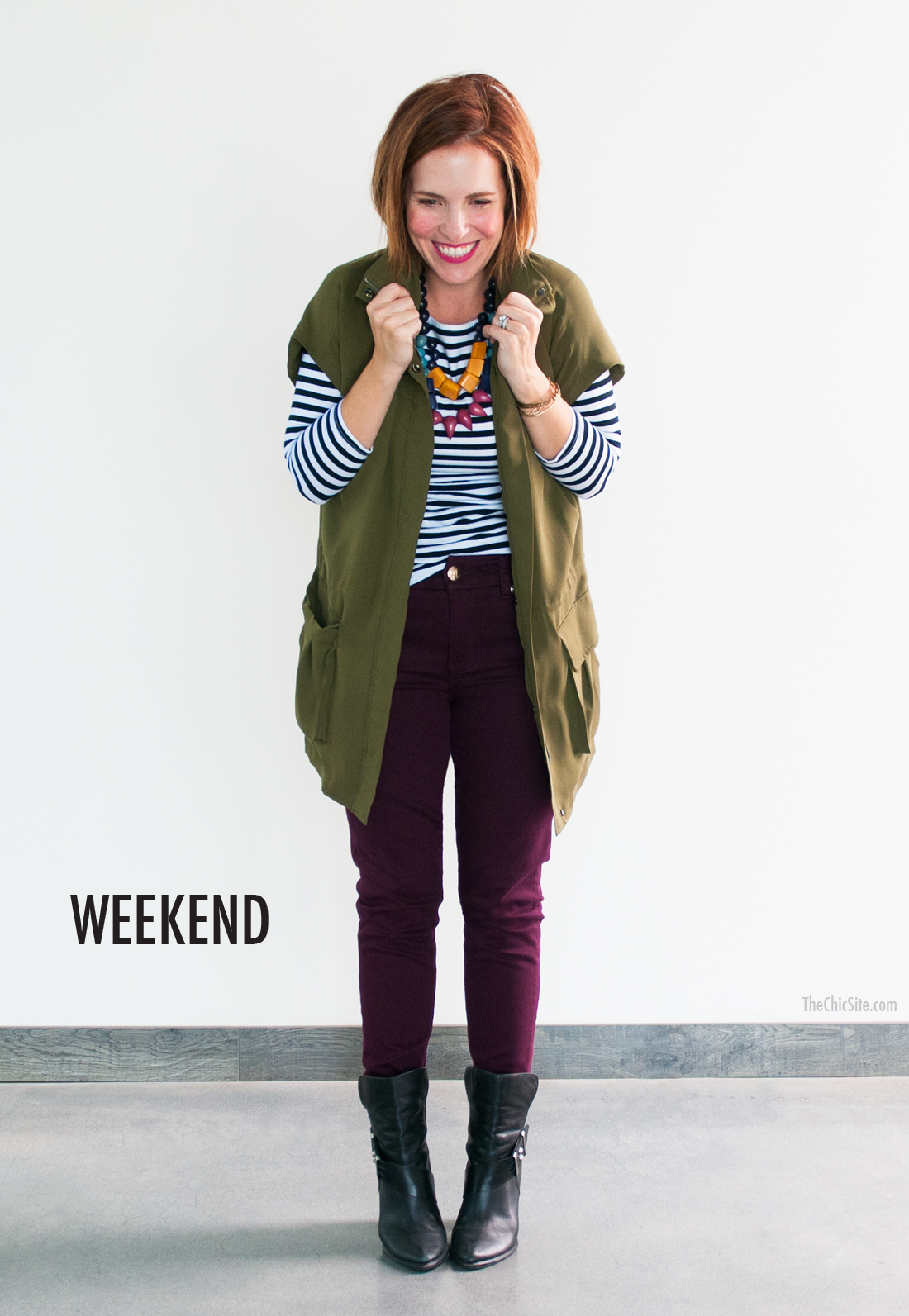 Hello. My name is Rachel and I never met a color I didn’t like. I know a lot of people will see purple jeans and think they should mute the other items in their outfit down… and that is true. But, you know what else is true? Bold color can look fabulous too! In this instance I’m pairing my favorite necklace with a lightweight jacket, boots and a striped tee.