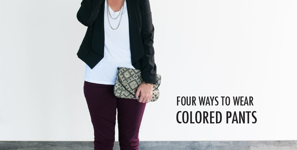 Just like this! Here are four ways to wear purple jeans, but you can substitute for any colorful denim you’d like to.