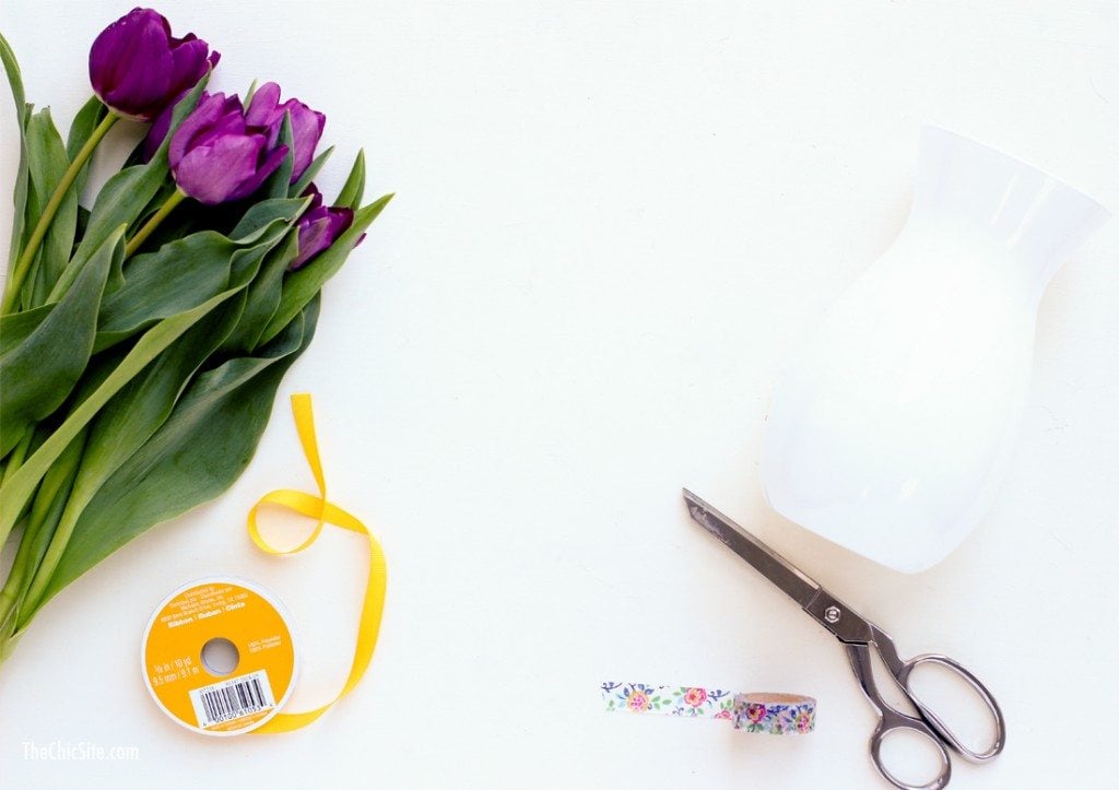 Add your flowers and then finish it off with a coordinating ribbon. It’s such a sweet look and easy enough that your kids can help you with it!