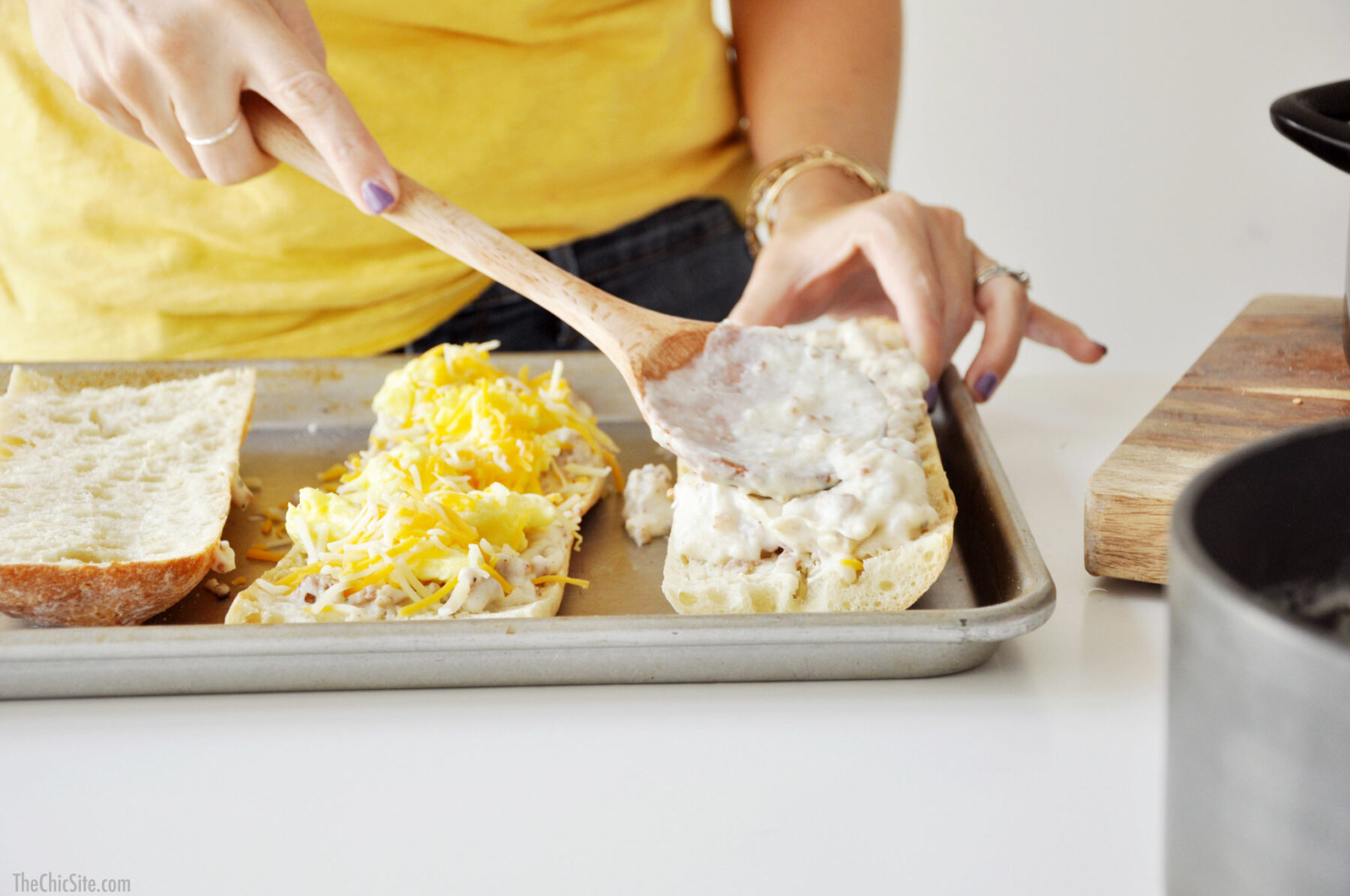 Spread the toasted ciabatta bread with the sausage gravy. Don’t be shy about it either.