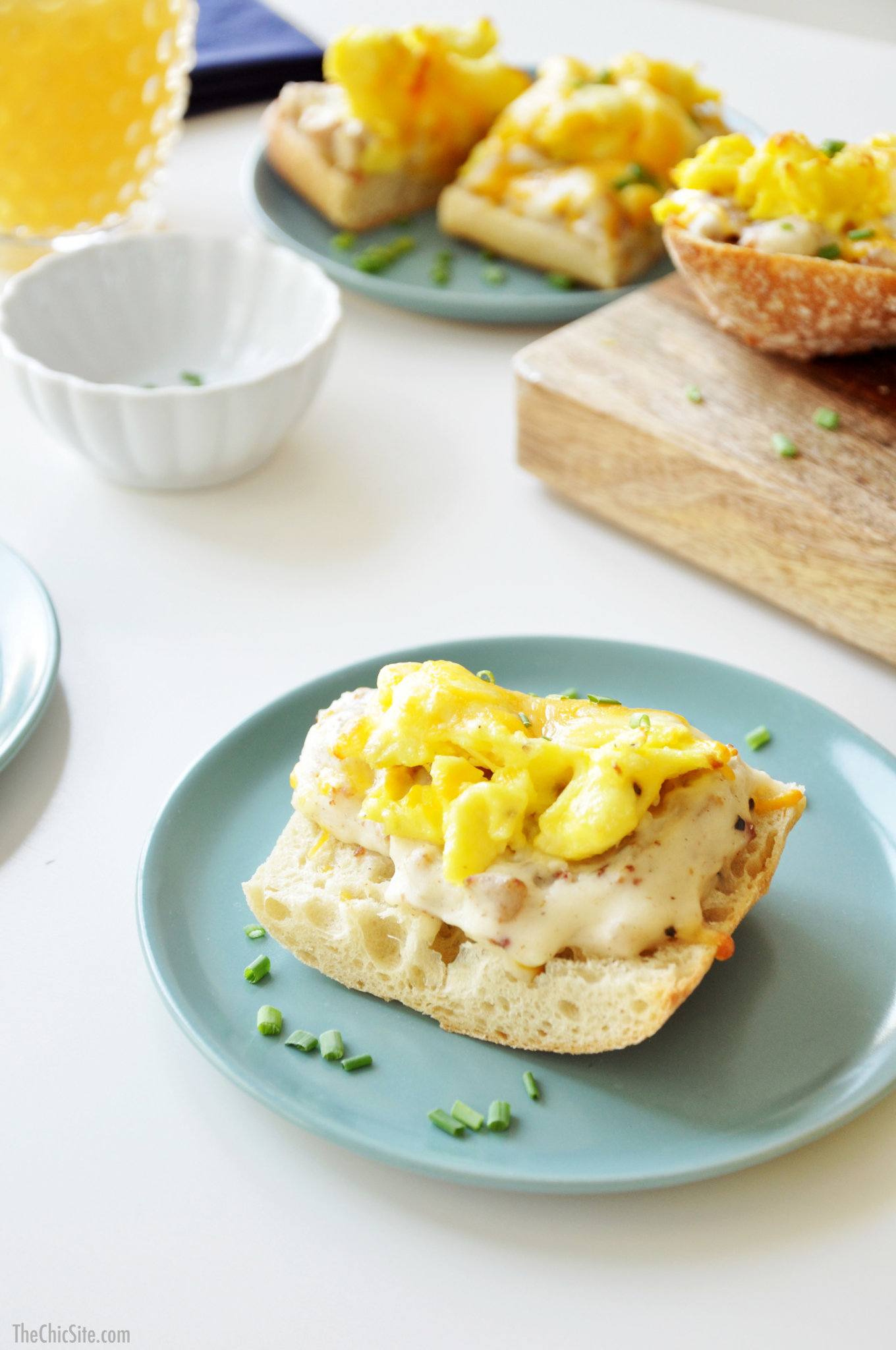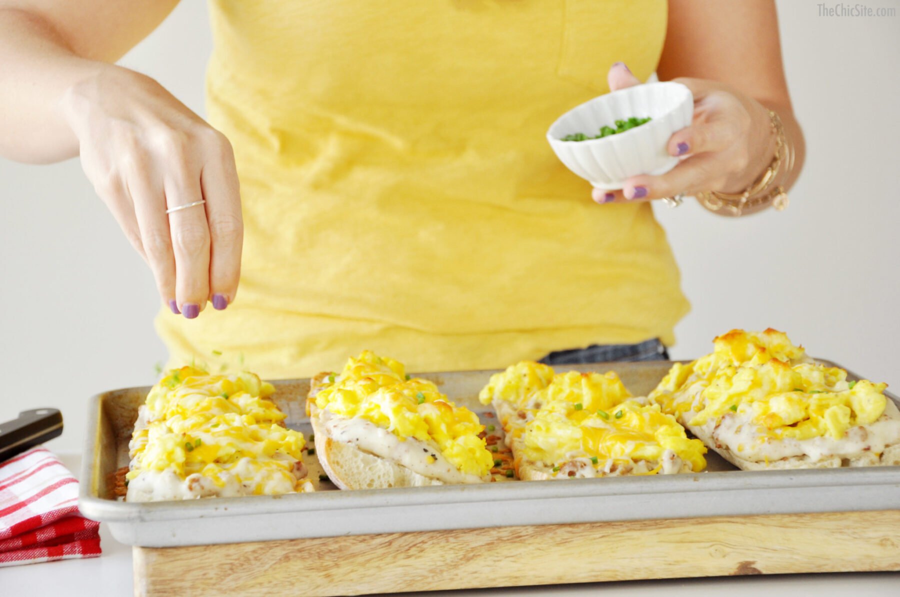 - Spread the gravy on top of the toasted ciabatta pieces. Top with the eggs and sprinkle with cheese. Bake for about 10 to 15 minutes. Remove from oven and sprinkle with chives. Cut and serve immediately.