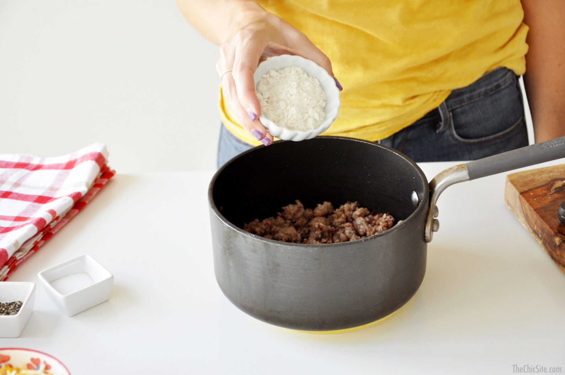 Brown the sausage in a medium saucepan, until browned and crispy. Then, stir the flour into the fat. Cook for a few minutes and stir in the milk.