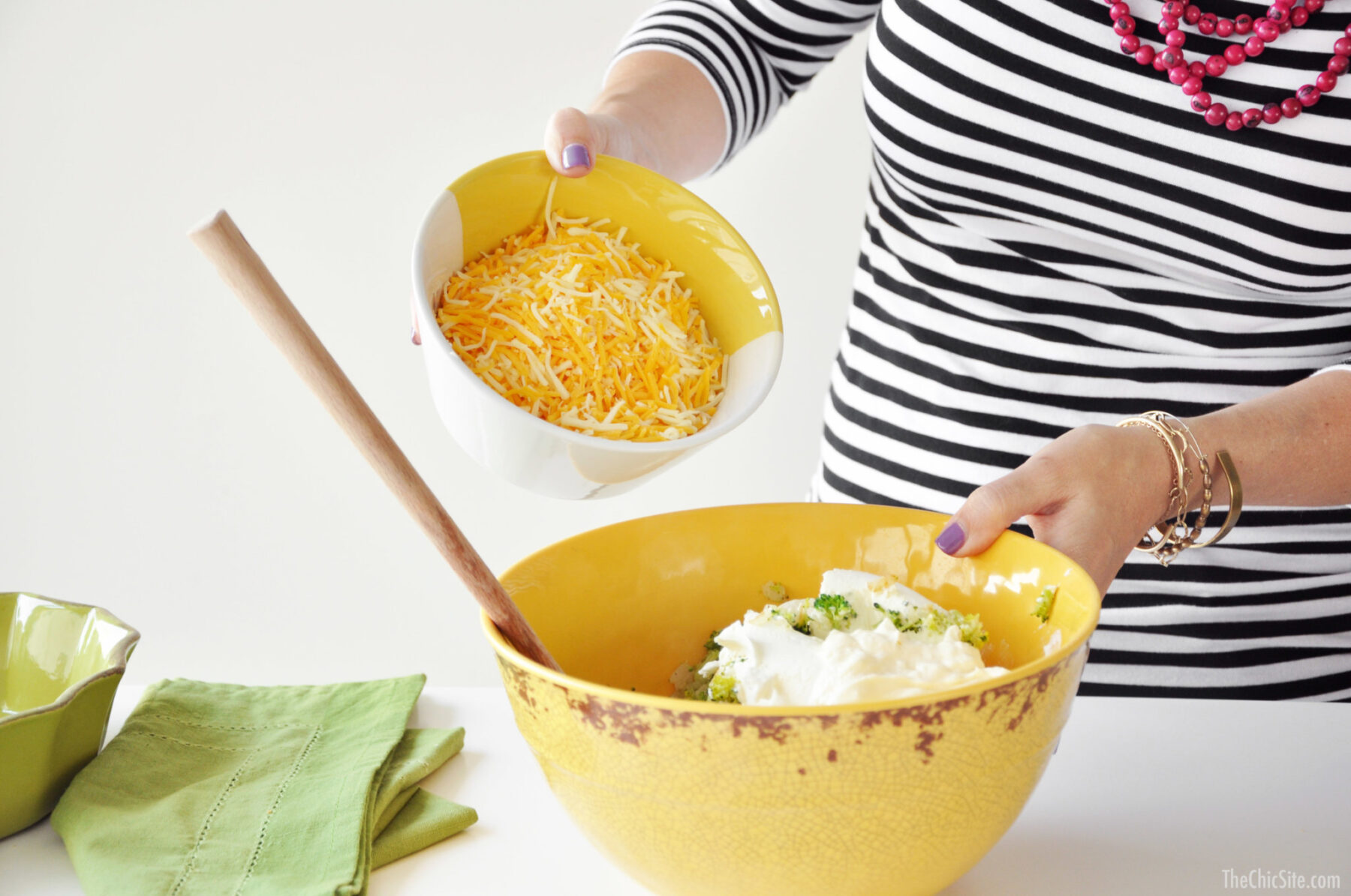 In a large bowl, combine the cream cheese, mayo, shredded cheese, onions and broccoli until creamy.