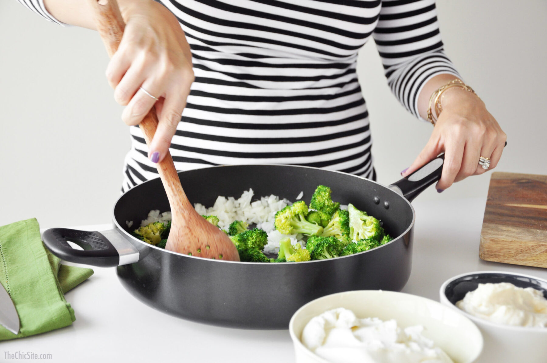 - Set a large saucepan over medium-high heat with the remaining tablespoon olive oil. Add the onions and cook, stirring often, until translucent, about 5 minutes. Stir in the broccoli and cook for another 5 minutes.