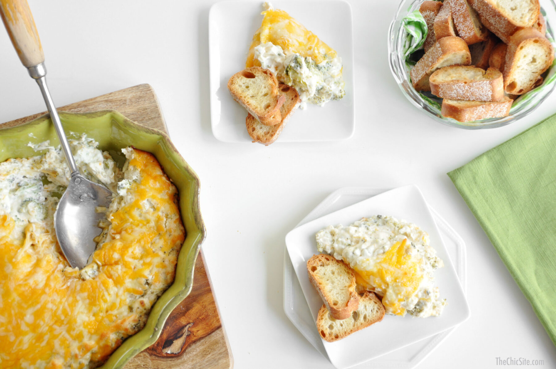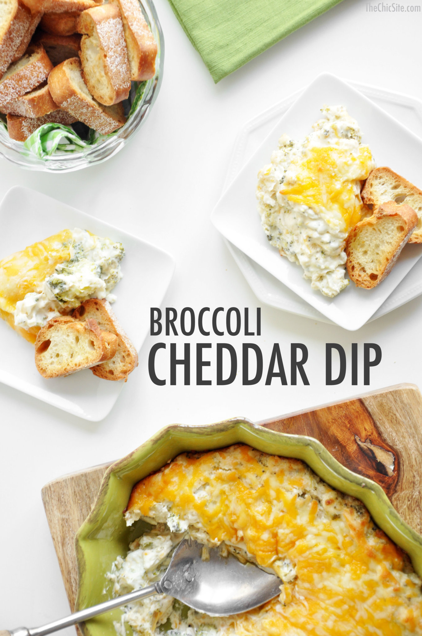 Bake your broccoli cheddar dip in a preheated 350 degree oven for about 20 to 25 minutes or until heated through and bubbly. Remove from oven and allow to cool down slightly (just so you don’t burn your mouth off).