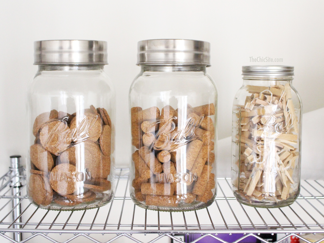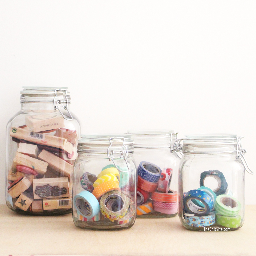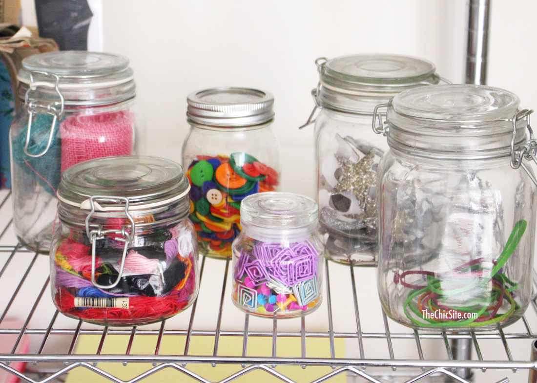 Next, came containers! We have a ton of props at the office for cooking stuff (we actually have three shelves for that area), so we had plenty of containers. I figured if we ever needed these mason jars or that bowl we could just borrow it and put it back. But, by utilizing the cool and clear vessels we have we were able to put the crafts on display. It’s such a fun burst of color when you walk into the room!