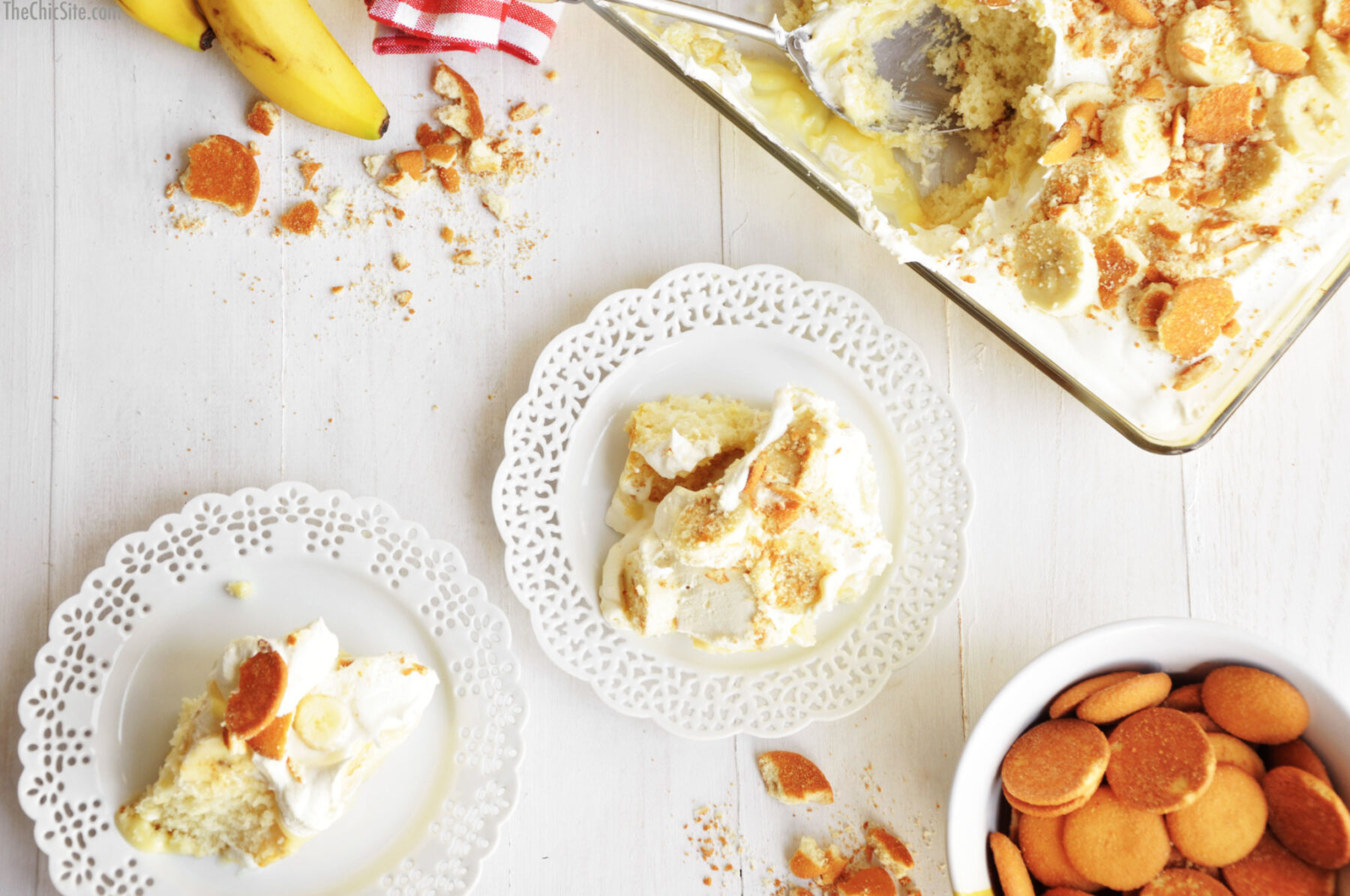 Right before serving, decorate the top of the cake with fresh banana slices and crushed vanilla wafer cookies.