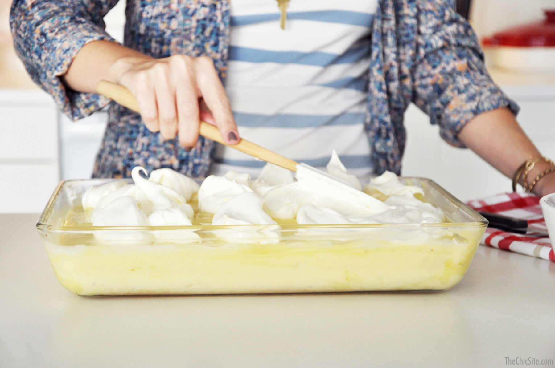 Spread the pudding evenly over the cake with a rubber spatula and then cover with plastic wrap and chill in fridge for at least 1 hour (this can be done the night before). Once chilled, dollop the top of the cake with the whipped topping. Spread out with a rubber spatula to cover the top completely.
