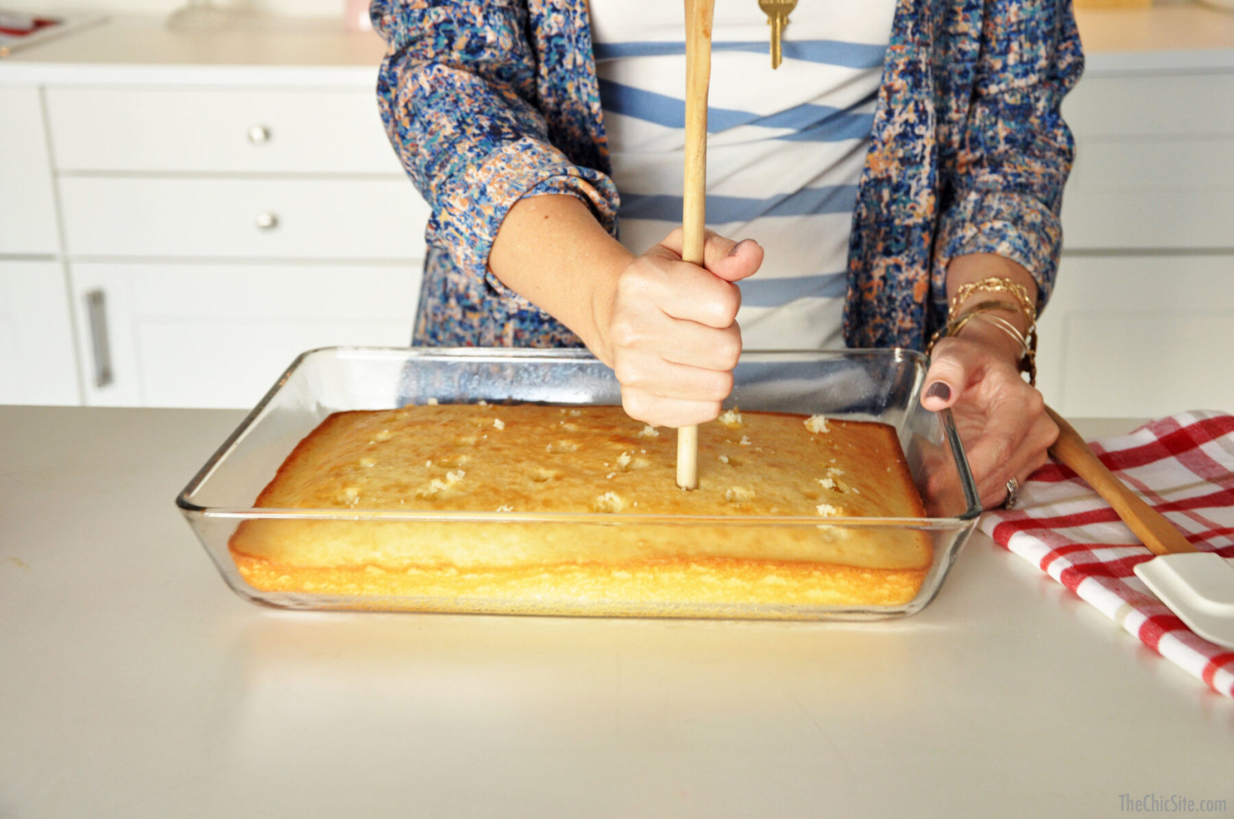 Once the cake has cooled completely, poke holes all throughout it with the handle of a wooden spoon. This will allow the pudding to soak in when we go to pour it on top.