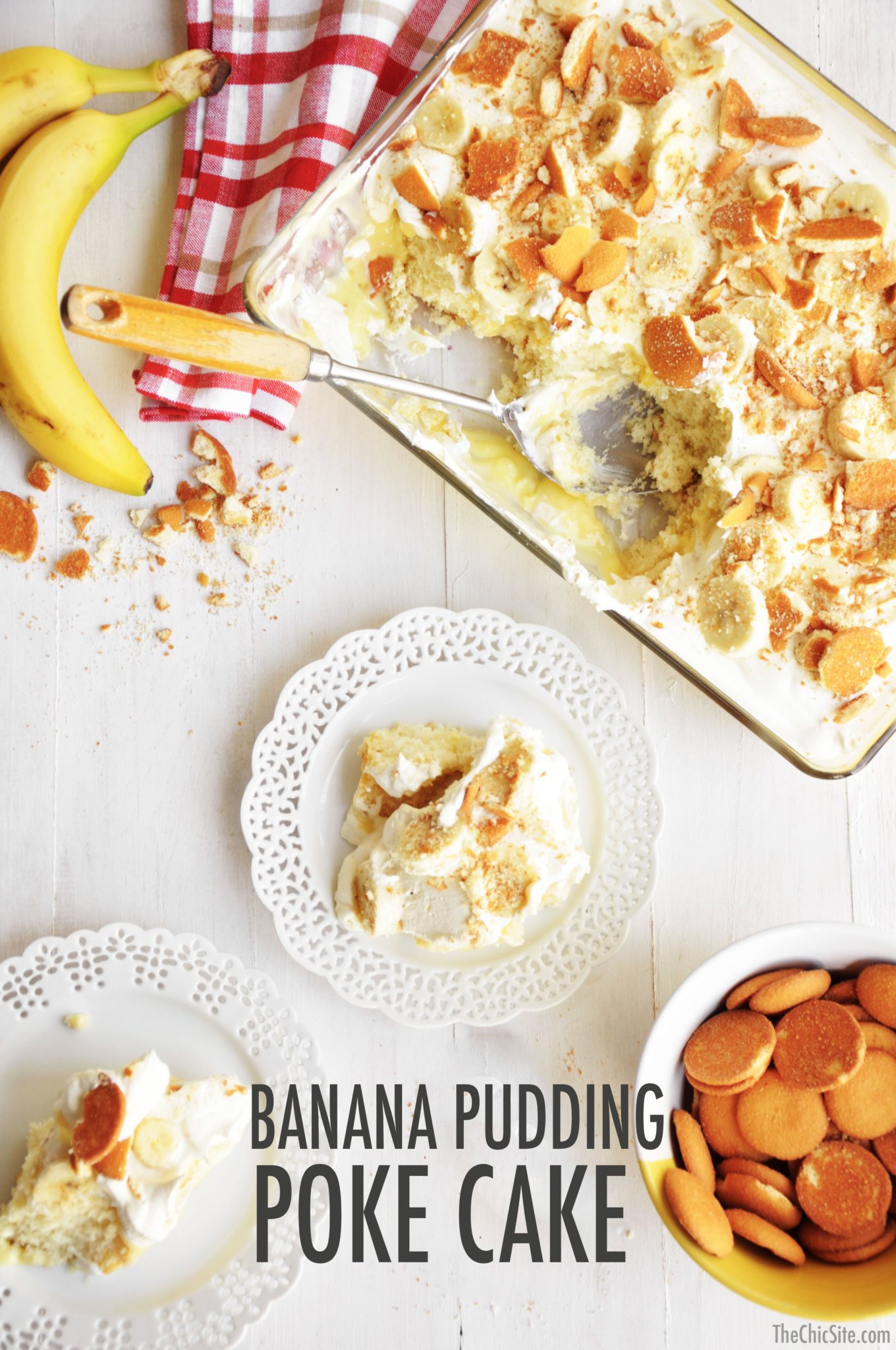 I’ve made banana pudding parfaits and peanut butter banana pudding and today I’m going to continue my obsession with a banana pudding poke cake! Have you guys ever had poke cake? We used to make them all the time with strawberry Jello and Cool Whip, and it turns out banana pudding is just as delicious. Watch the video to see how I made it and then scroll on down for the steps.