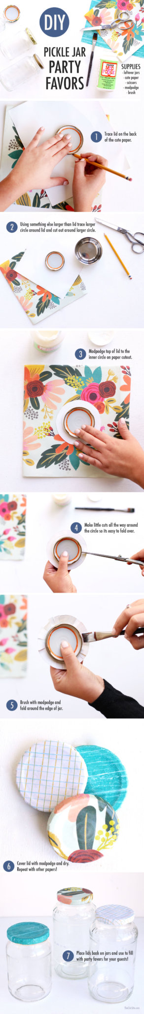 Follow the steps above to make your pickle jar party favor and then you can hand them out at your next dinner party or even give them as a hostess gift. I love the idea of filling them with craft supplies to encourage others to get crafty like you did, but the options for what to include are endless.