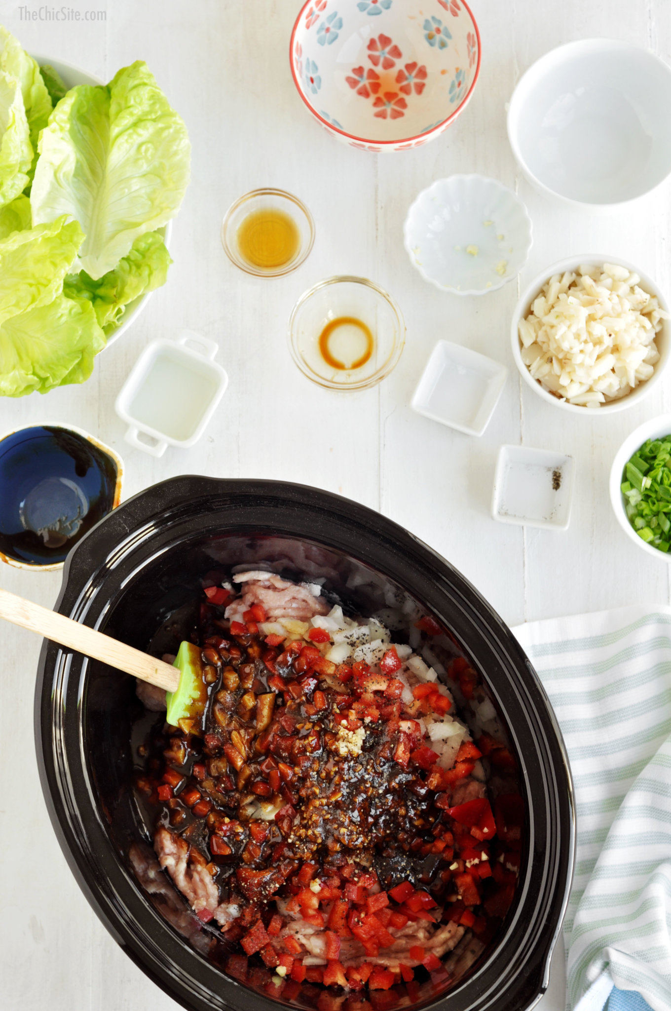 Throw everything into the bowl of your slow cooker except for the lettuce, water chestnuts, scallions, rice vinegar and sesame oil.