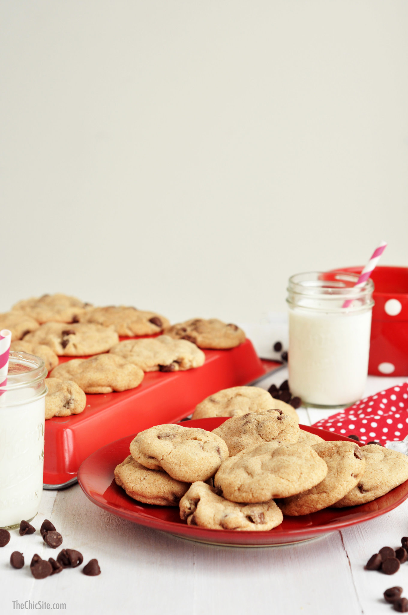 A couple of weeks ago Dave decided to help the boys bake cookies and he used some snickerdoodle cookie dough we’d bought from a school fundraiser. And then because he’s a dad (and awesome) he let the boys decorate the cookies with chocolate chips. I was sent in later to “taste test” their creations and I nearly ate the whole plate. The next day I marched into work and announced to Jonathan that we HAD to put a recipe up on this site for Chocolate Chip Snickerdoodles… because they’re the greatest cookie ever!