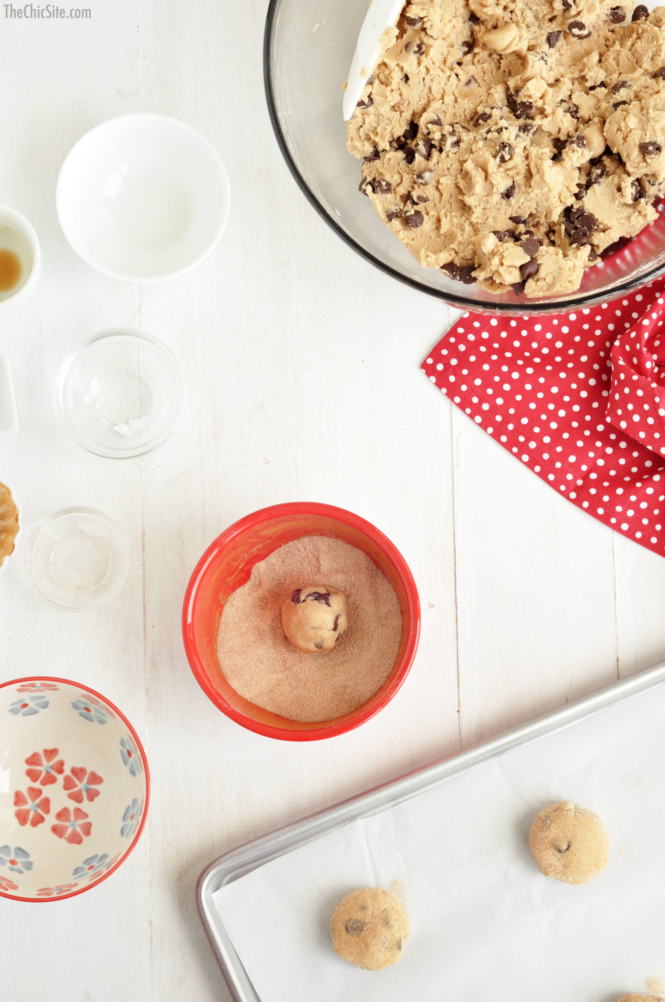 - Cream together the butter and sugar until fluffy, about 3 minutes. Add the egg and vanilla and stir until well combined. Add the flour and mix until just incorporated. Stir in the chocolate chips. Roll about 1 tablespoon of dough in between your hands and roll around in cinnamon sugar. Place on baking sheet and flatten lightly with the palm of your hands.