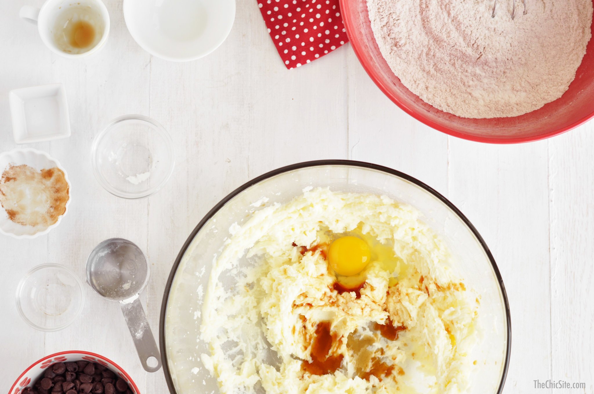 In a large mixing bowl, cream together the butter and sugar on high until light and fluffy, about 5 minutes. Once creamy, add the egg and vanilla to the mixture.