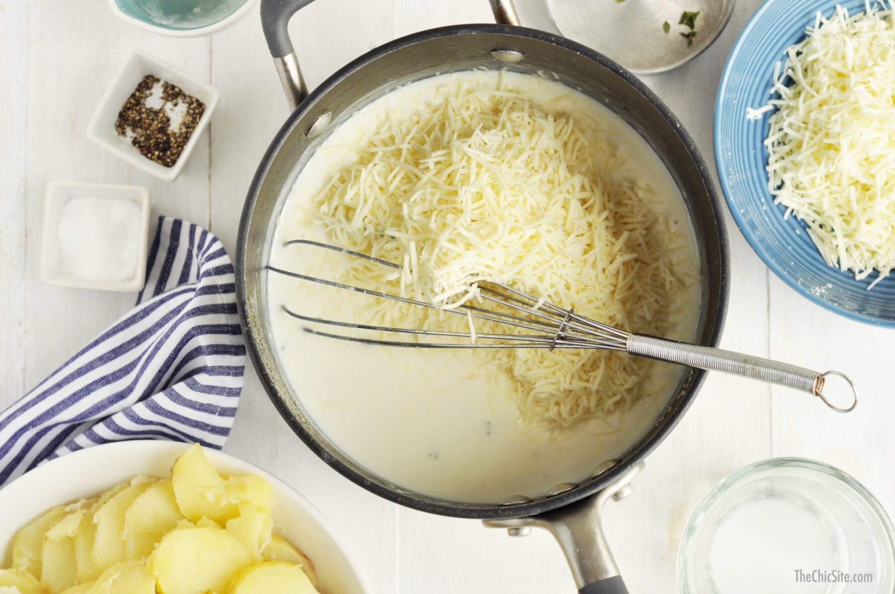 - Set a saucepan over medium heat and add the butter. Once melted, stir in the flour and cook for about 30 seconds. Slowly stream in the milk, while whisking. Cook on low until thick along with the garlic and thyme. Season with 1/2 teaspoon salt and 1/2 teaspoon black pepper. Once thick, remove from heat, discard the thyme and garlic and stir in the cheese (reserving some for the top).