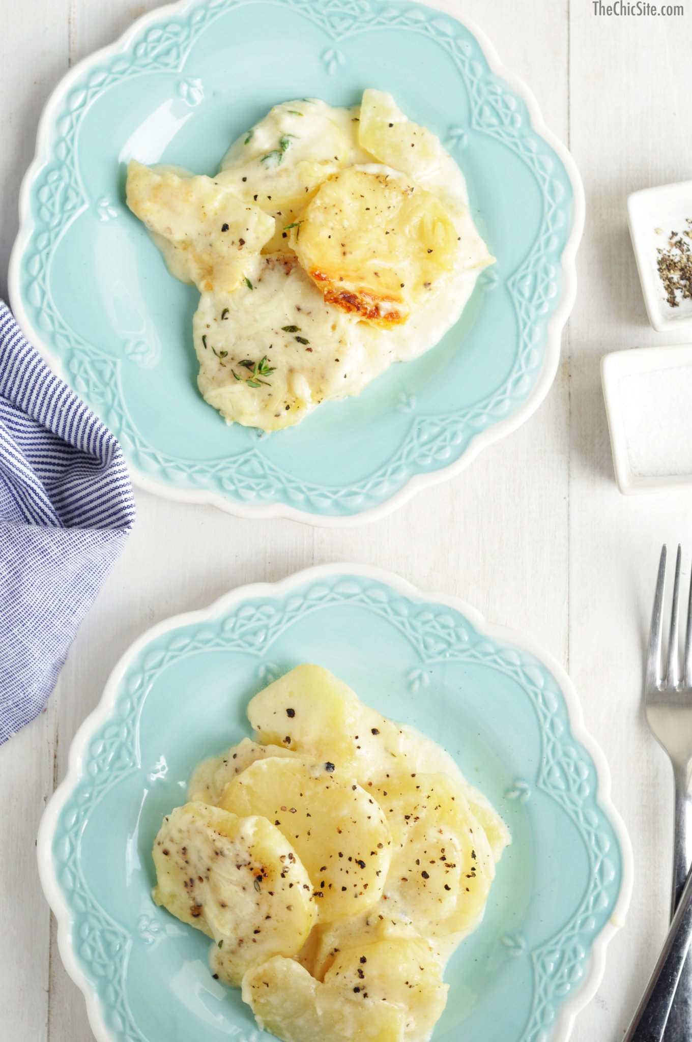I know we tend to use our crockpots to make the main dish but I think it’s a great resource for side dishes as well. These slow cooker potatoes au gratin are the perfect compliment for my oven braised drumsticks or our bacon cheeseburger meatloaf.