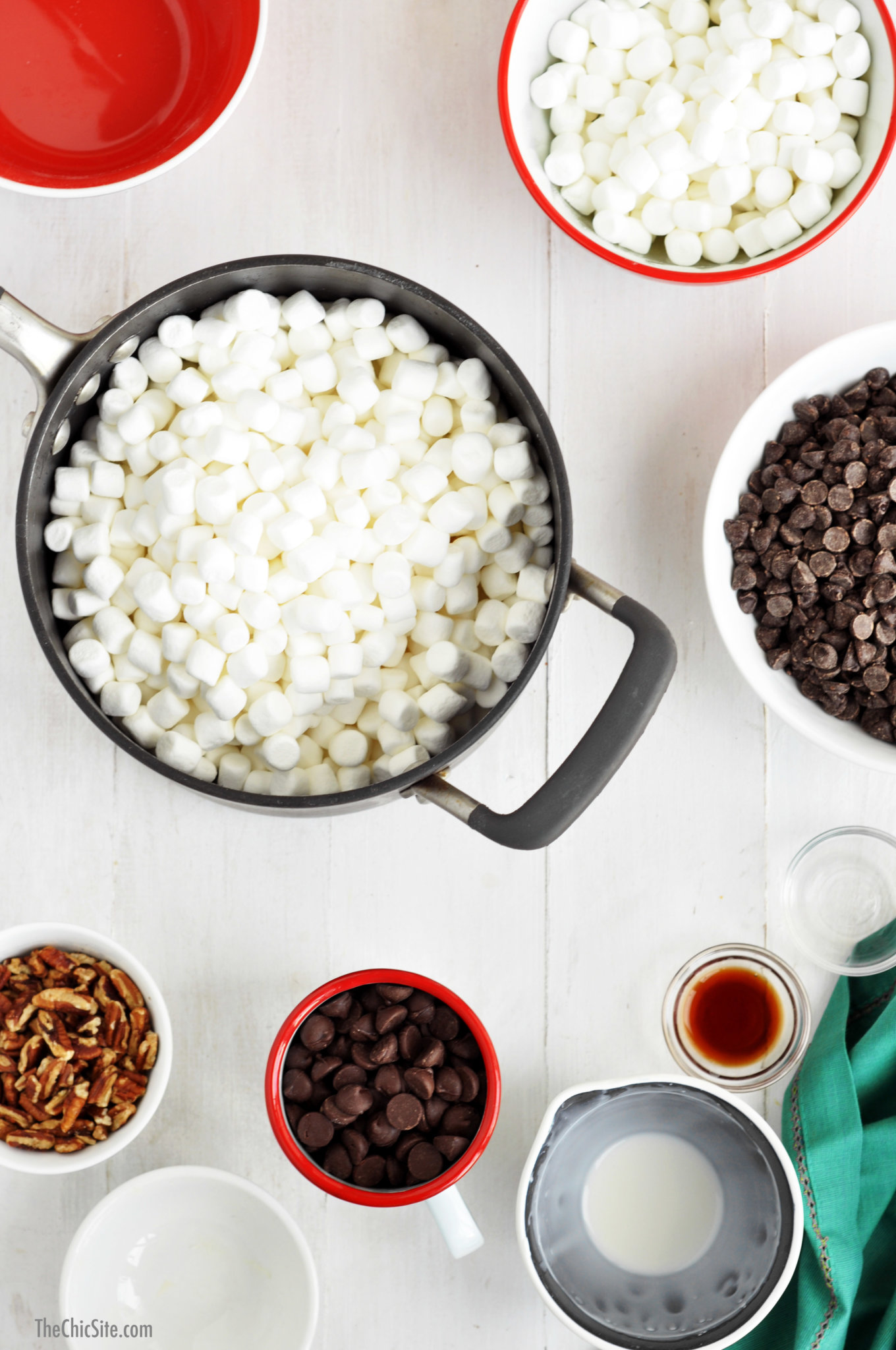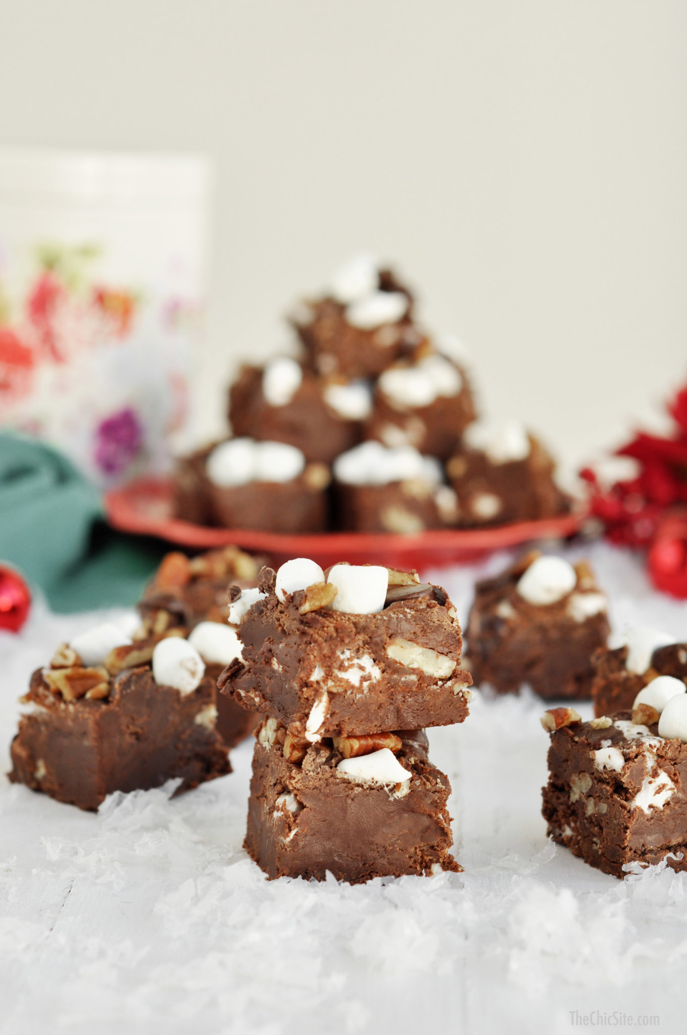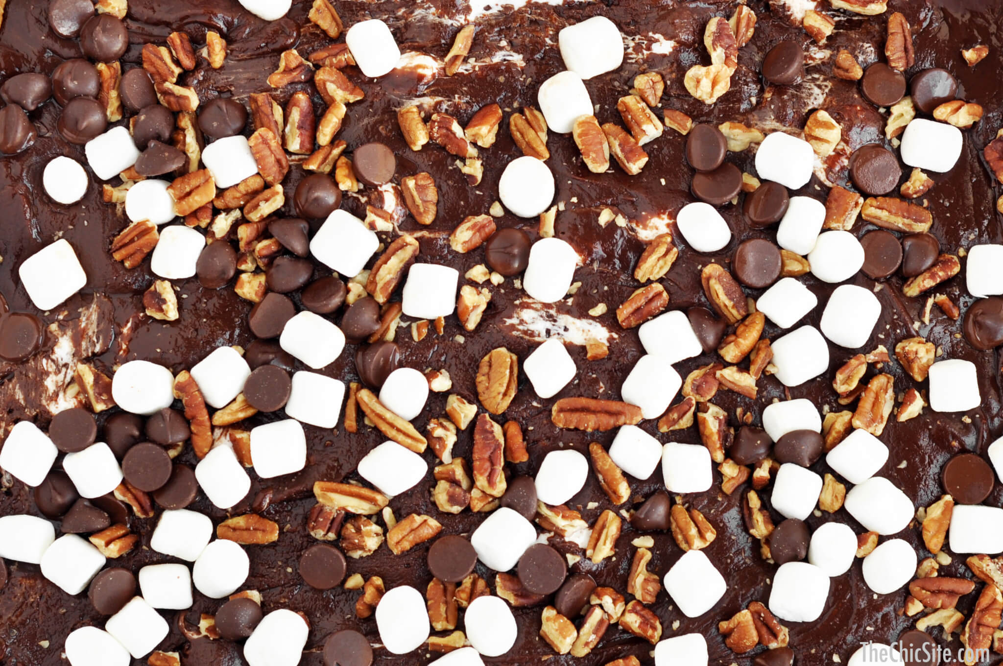 - Stir in 1 cup marshmallows, 3/4 cup dark chocolate chips, and 3/4 cup pecans. Line a 9×13-inch baking dish with parchment or wax paper and then grease lightly with cooking spray. Pour the fudge mixture into the dish and spread out into an even layer with a rubber spatula. Top with the remaining 1/2 cup marshmallows, 1/4 cup dark chocolate chips, and 1/4 cup pecans.