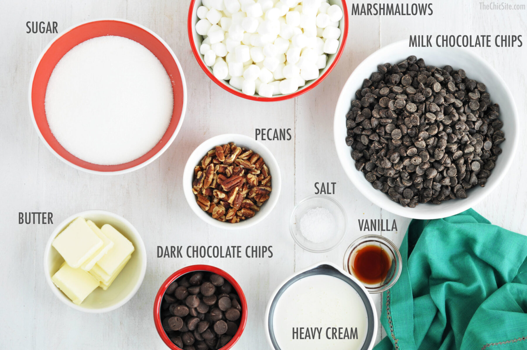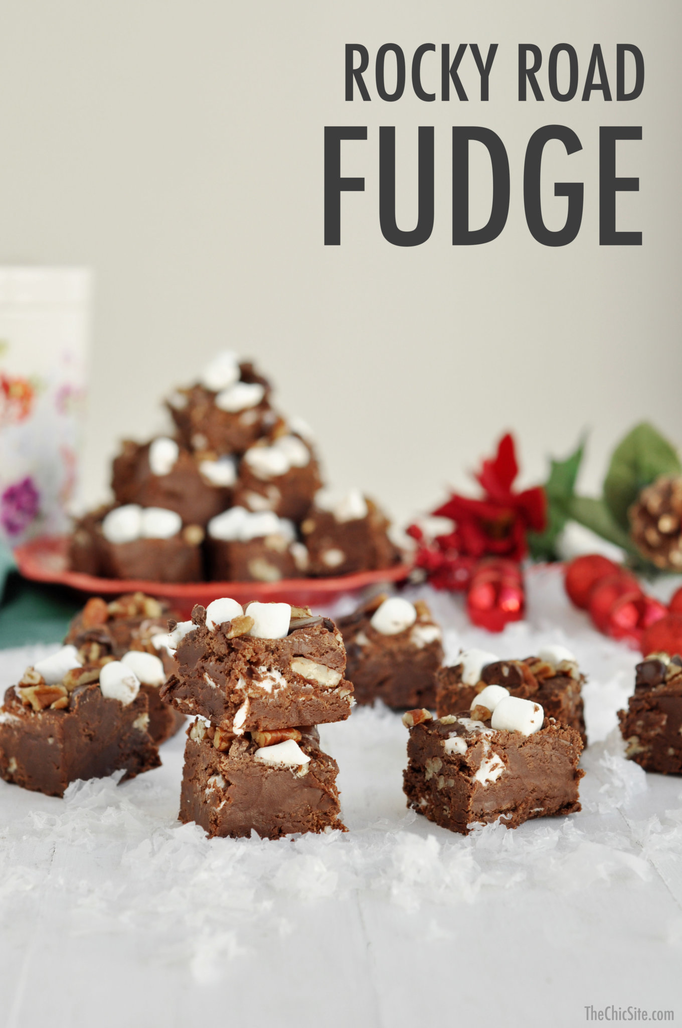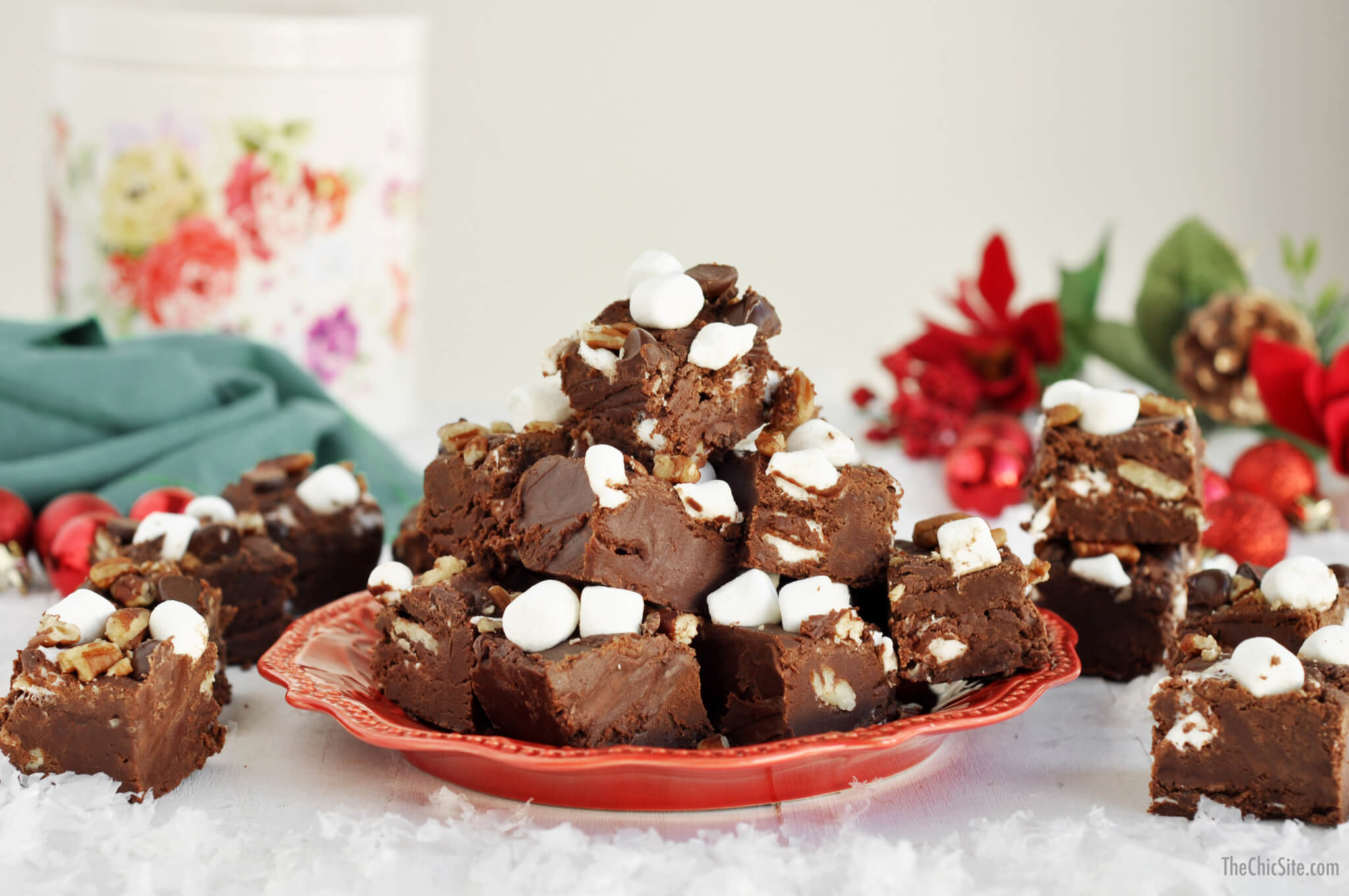 - Stir in 1 cup marshmallows, 3/4 cup dark chocolate chips, and 3/4 cup pecans. Line a 9×13-inch baking dish with parchment or wax paper and then grease lightly with cooking spray. Pour the fudge mixture into the dish and spread out into an even layer with a rubber spatula. Top with the remaining 1/2 cup marshmallows, 1/4 cup dark chocolate chips, and 1/4 cup pecans.